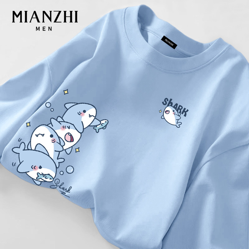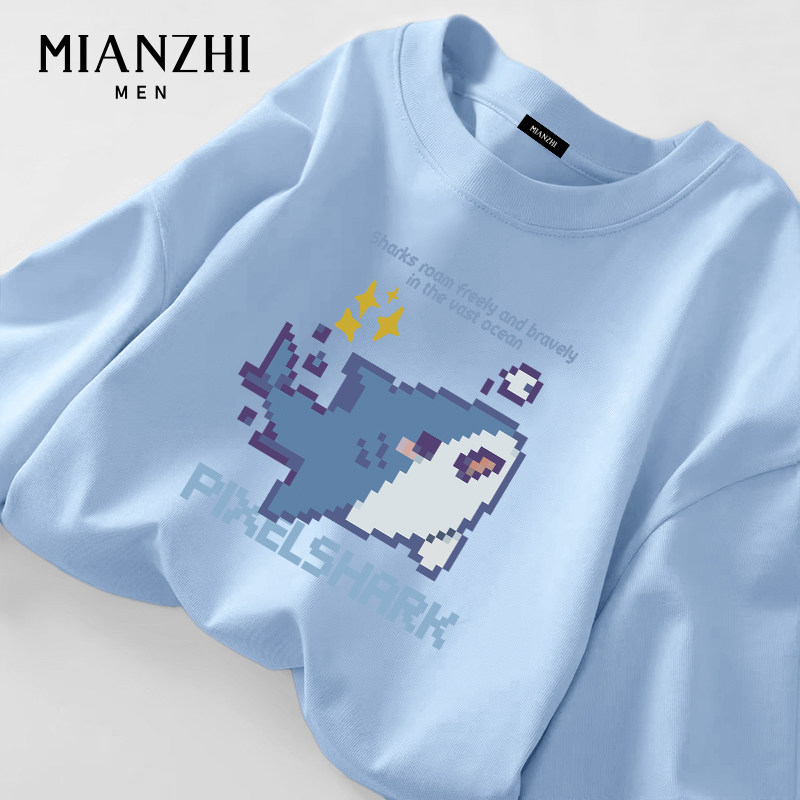 棉致像素风小鲨鱼长袖 t恤男白色宽松2026春秋纯棉卡通内搭打底衫