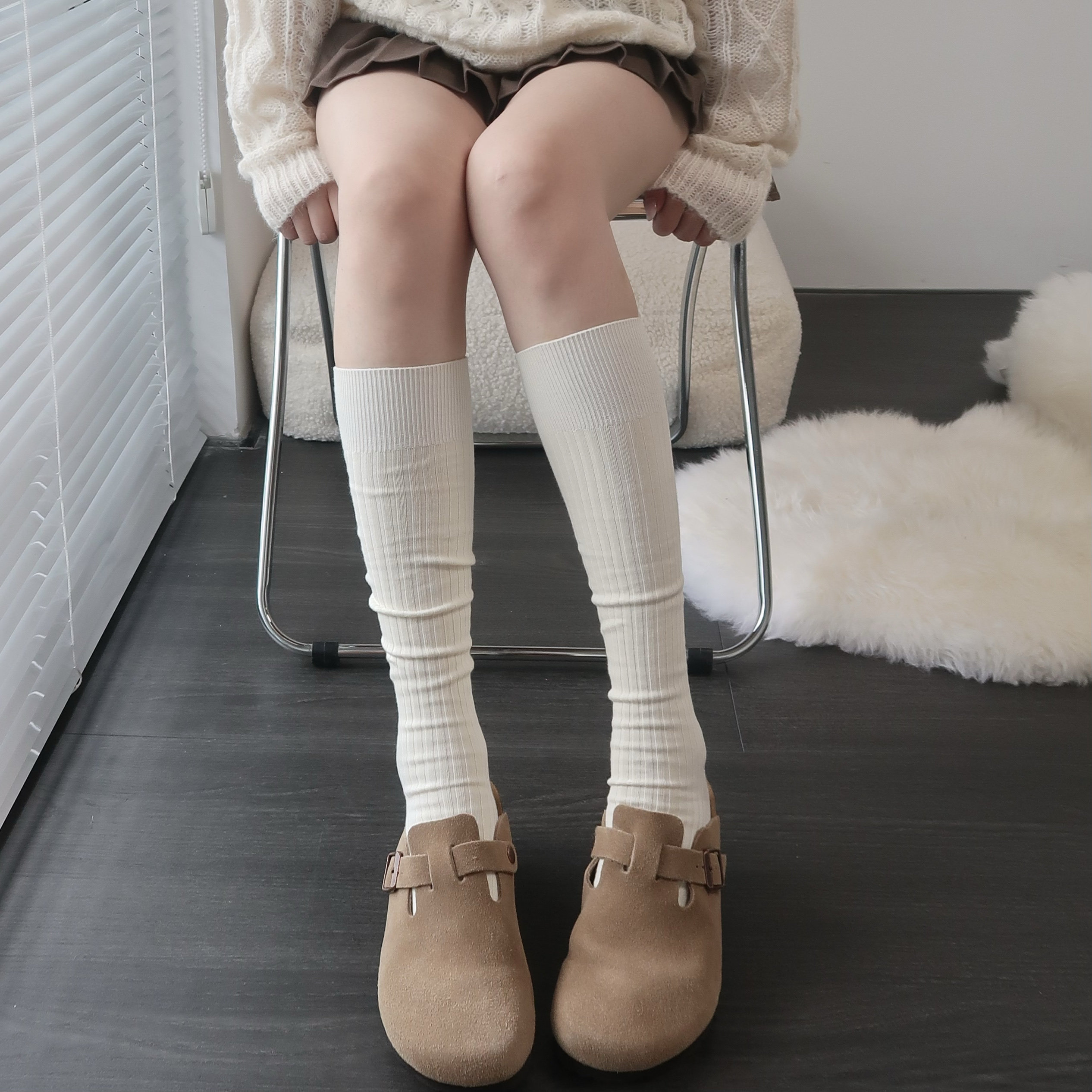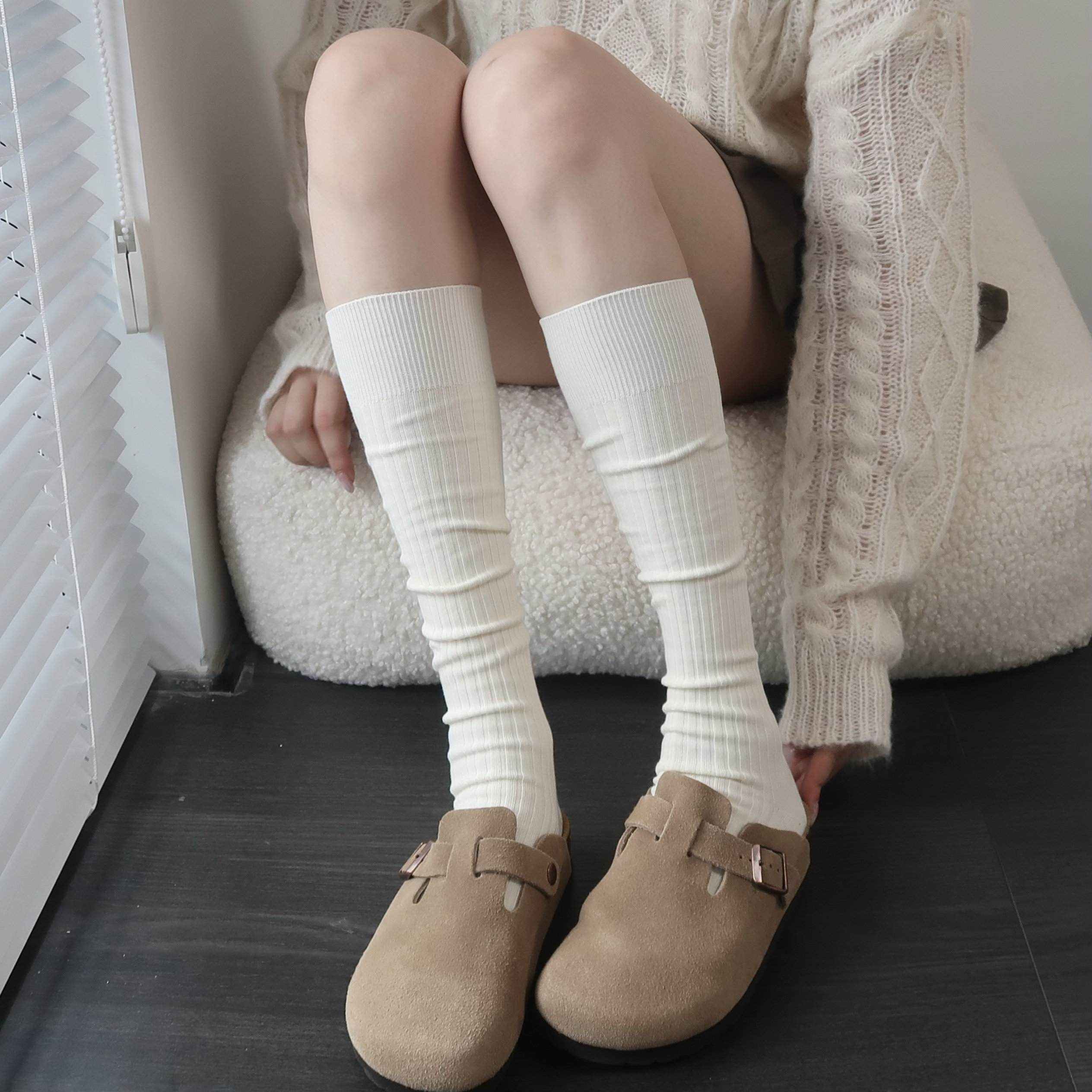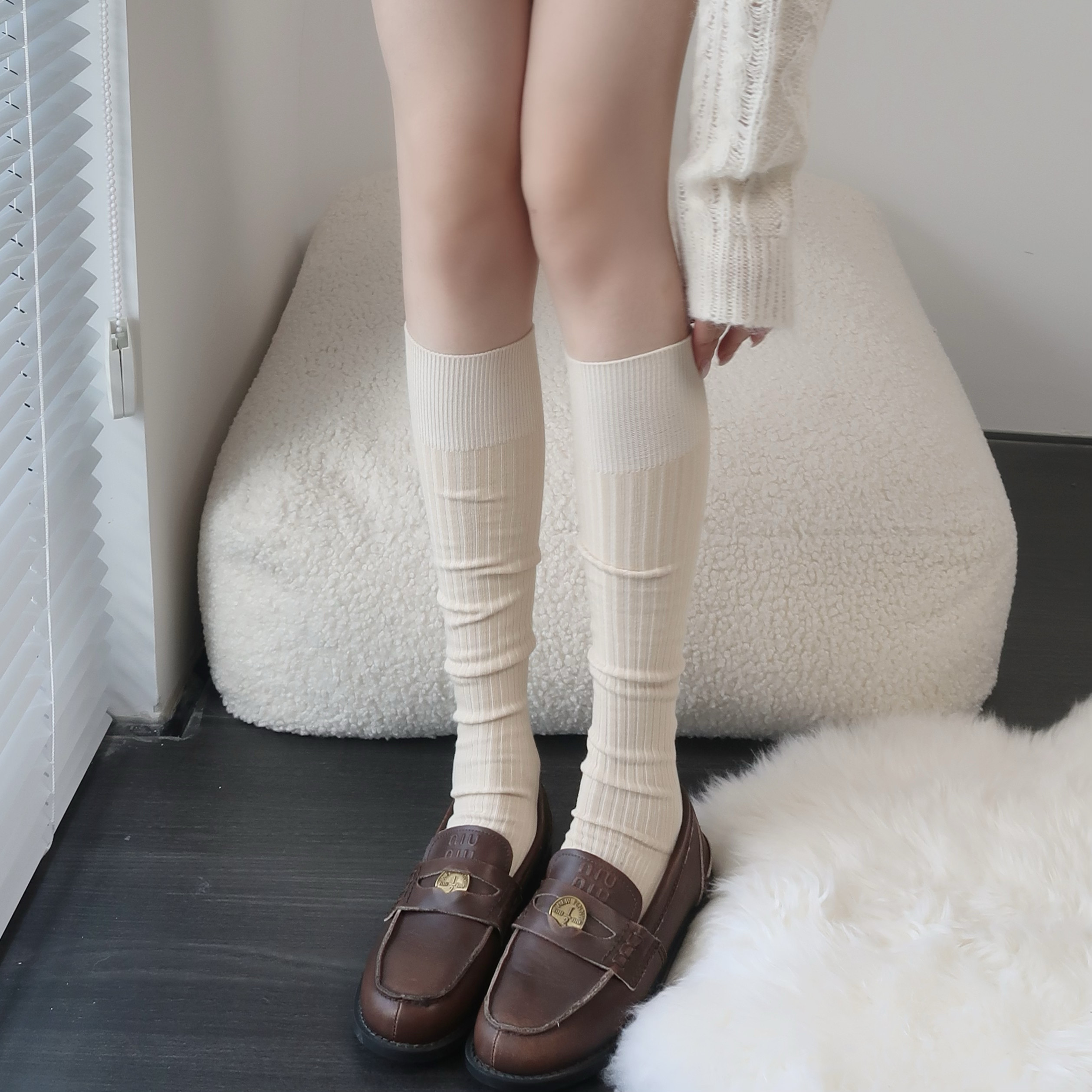 春秋米白色小腿袜女棉竖纹咖啡色堆堆袜子及膝烟灰色中长筒袜