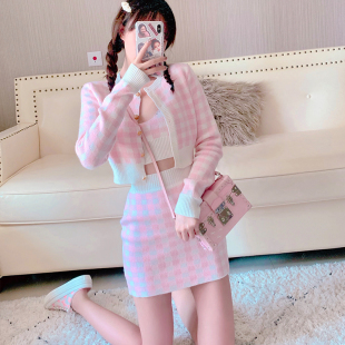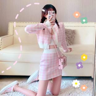 女甜美小清新长袖 针m织套装 毛衣短外套包臀裙三件套 时尚 2020春装