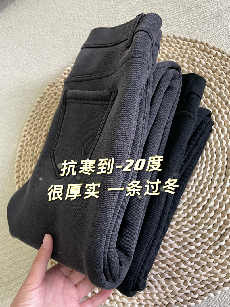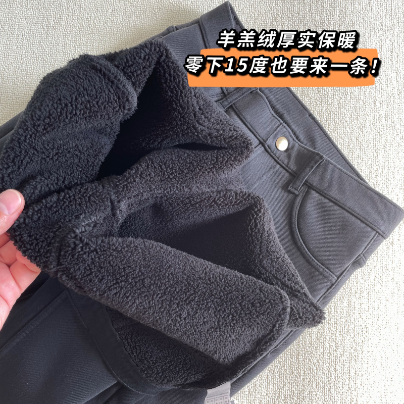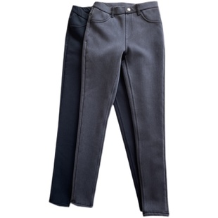 亚麻棉针织加绒松紧高腰高弹力大显瘦羊羔绒保暖加厚小脚裤 黑灰女