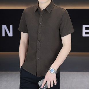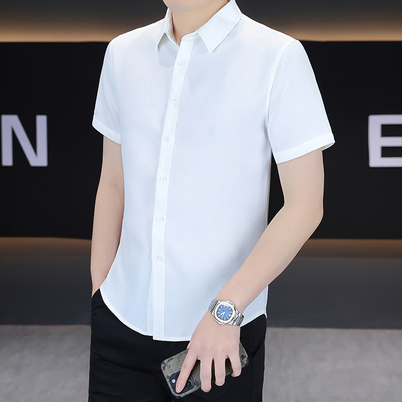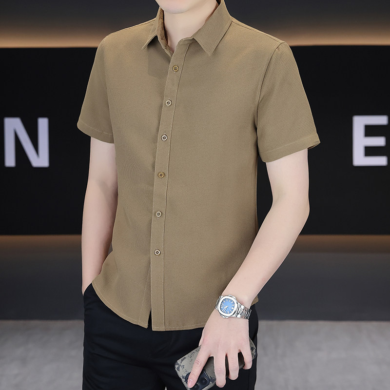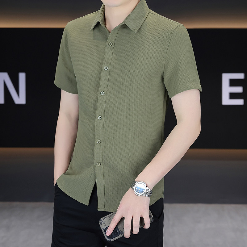 男士 修身 短袖 韩版 简约百搭年轻商务高级感衬衣 纯色华夫格衬衫 夏季