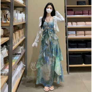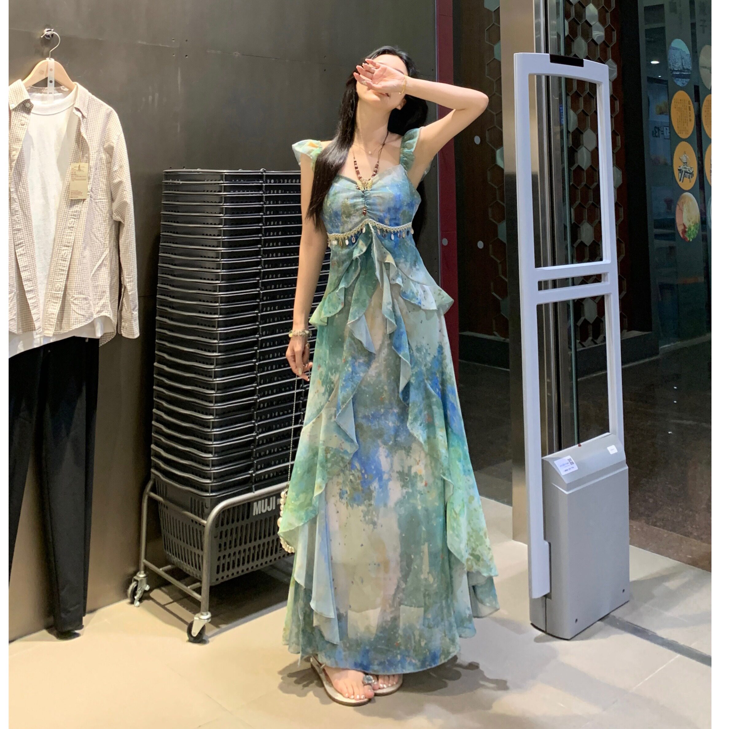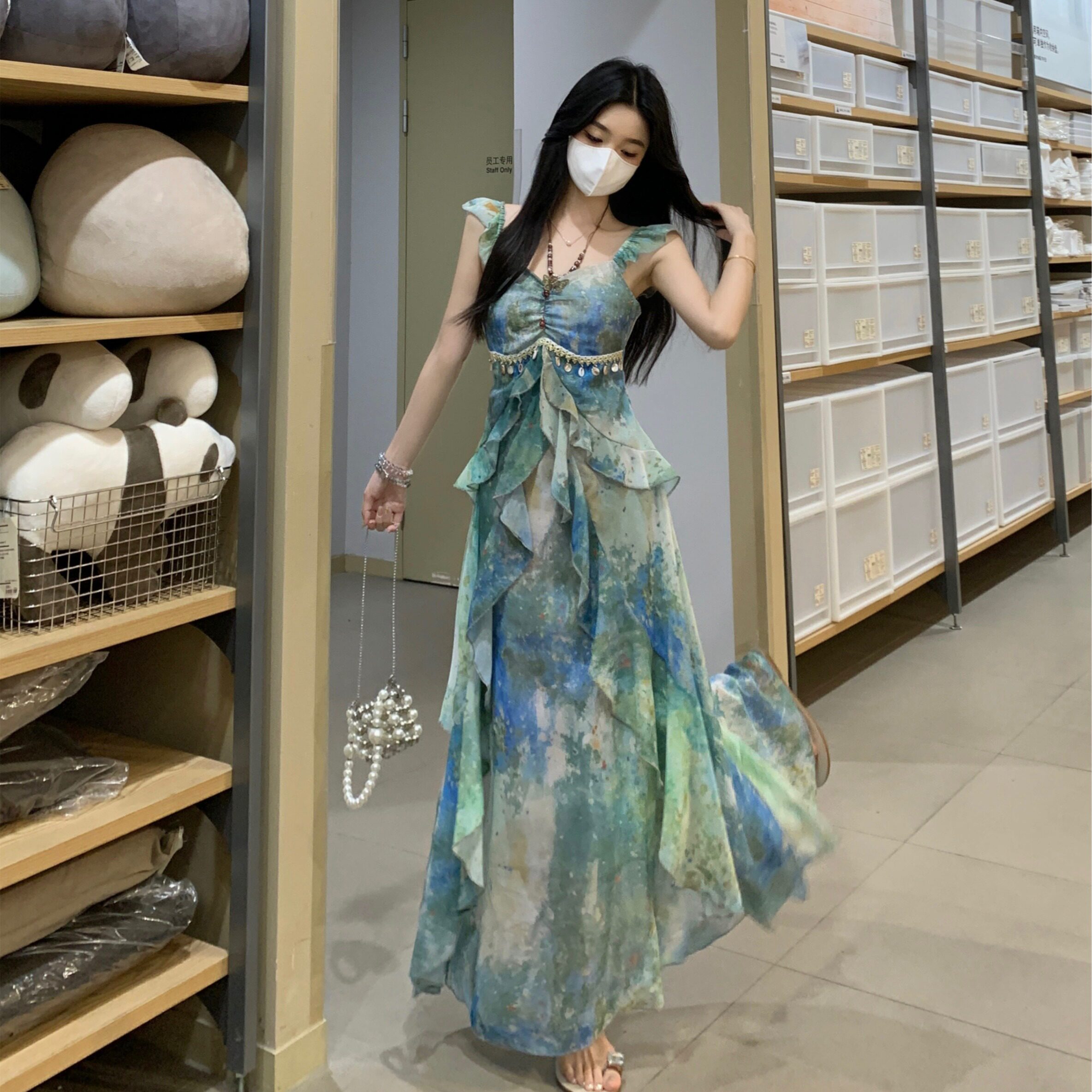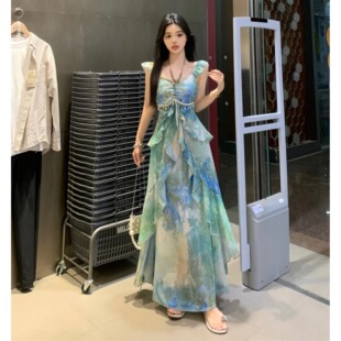油画气质吊带裙胖mm印花雪纺显瘦遮肉连衣裙女 夏季 小吉家大码 女装