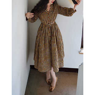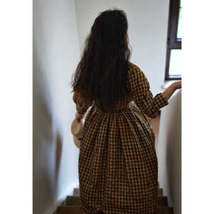 收腰赫本风大摆A字裙 岩缩棉泡泡袖 Chings法式 复古田园格纹连衣裙