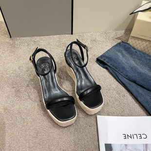 坡跟草编厚底女鞋 2026欧美新款 夏新款 超高跟一字扣带松糕凉鞋 时尚
