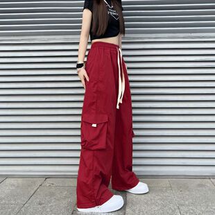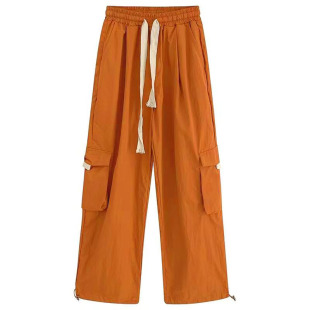 橙色高腰宽松直筒多口袋阔腿拖地休闲运动裤 女夏季 裤 日系飘带工装