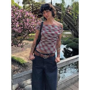百搭短款 小众别致气质格子一字领露肩T恤女夏季 上衣 Wen Vintage