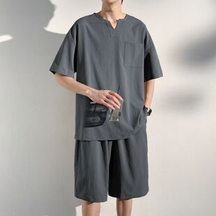 新款 300斤运动套装 男士 中国风特大码 V领T两件套 休闲套装 2025夏季