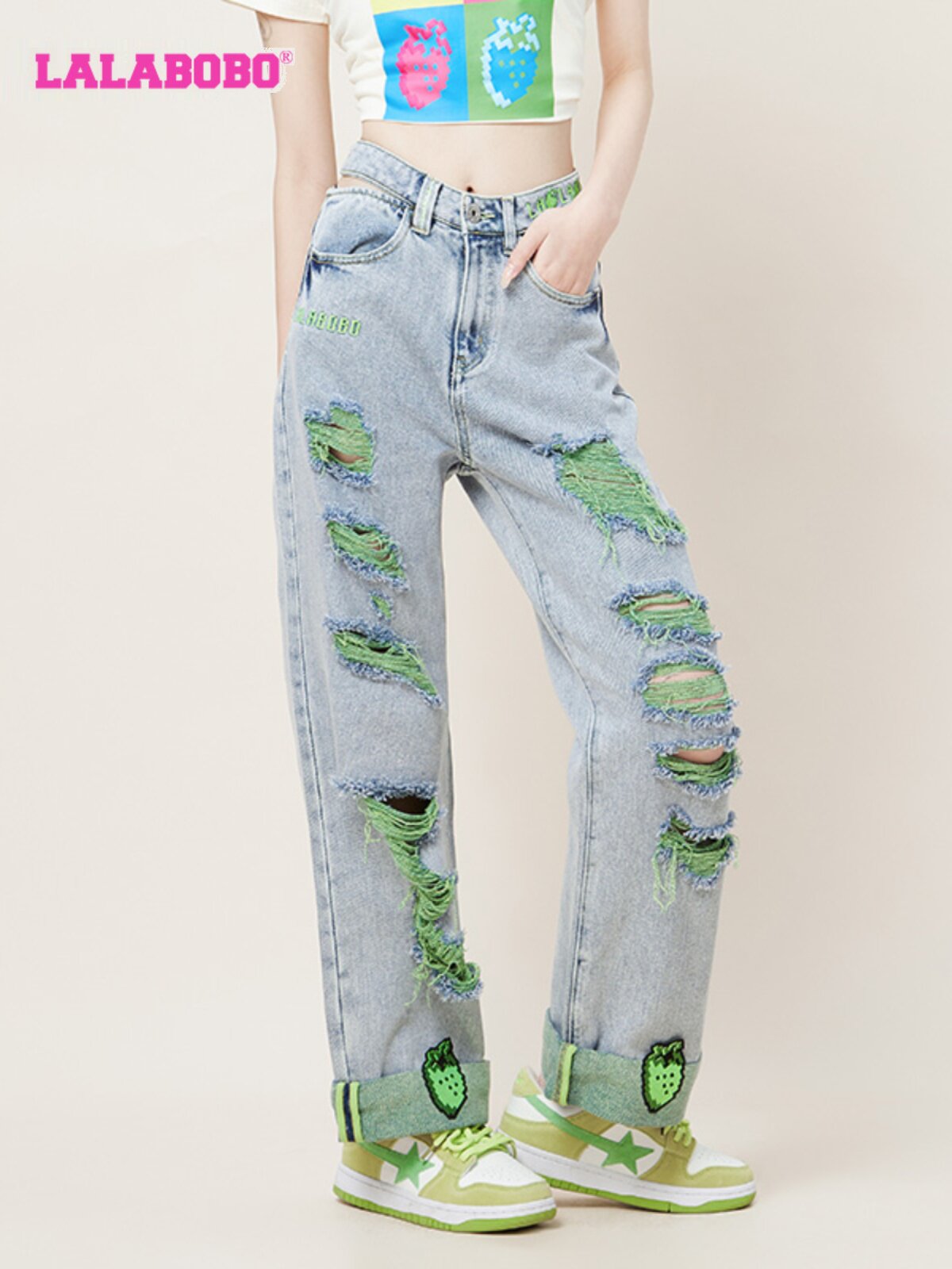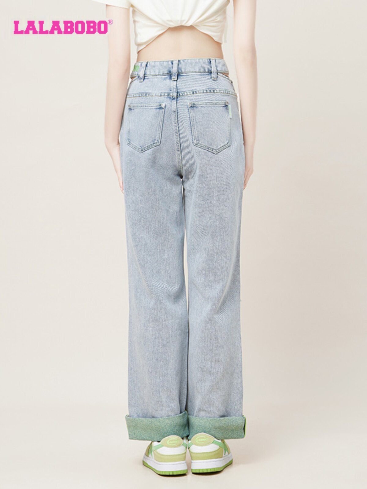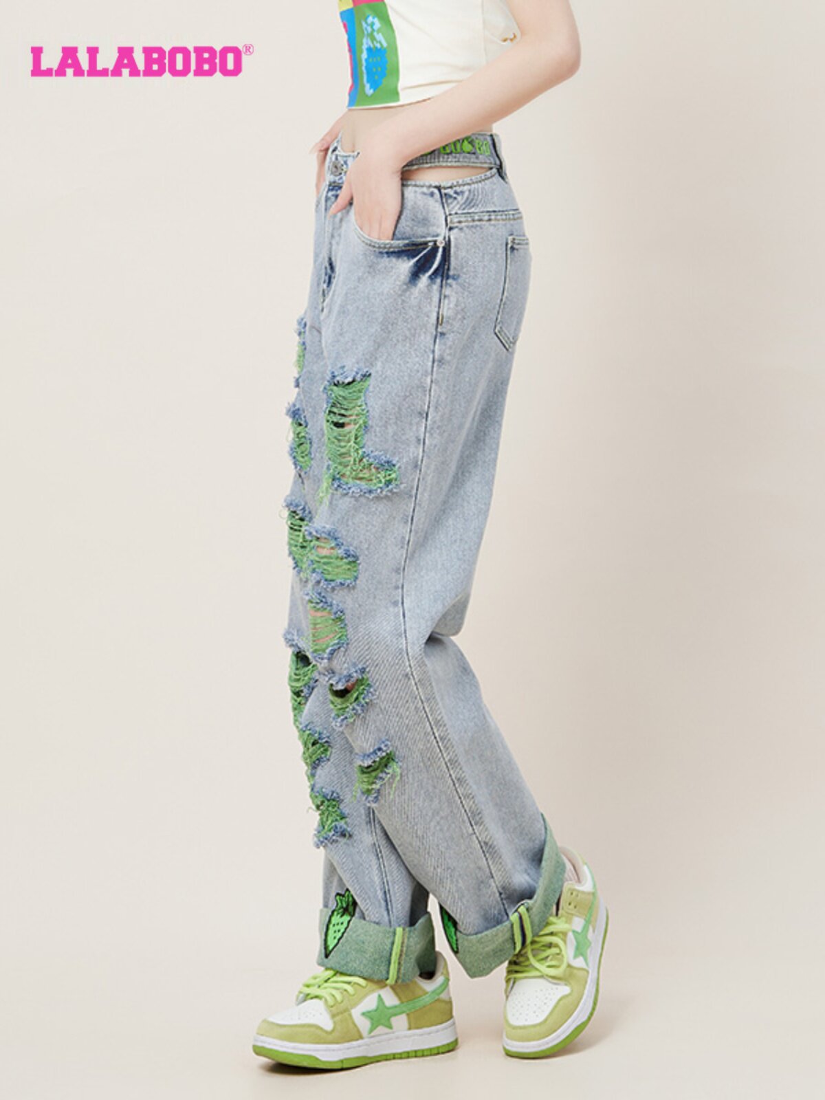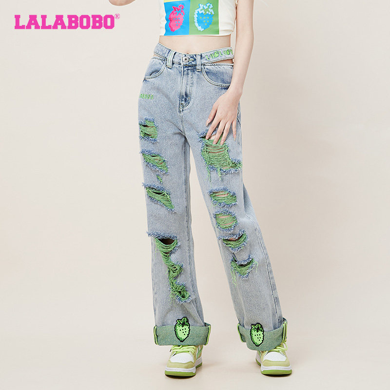 新款 LBCB 美式 女 WXZC16 刺绣破洞休闲直筒牛仔裤 LALABOBO2023夏季