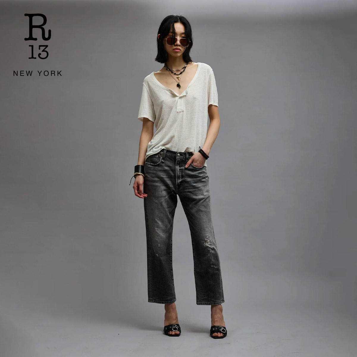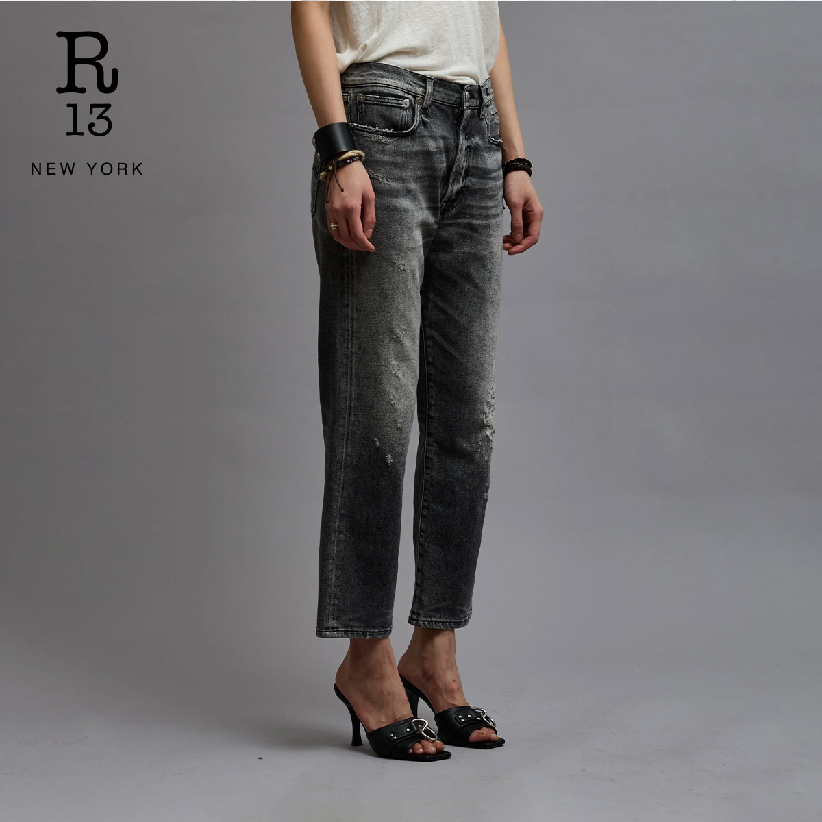 热销补货 直筒牛仔裤 R13 复古灰色中腰修身 男女同款 BOYFRIEND