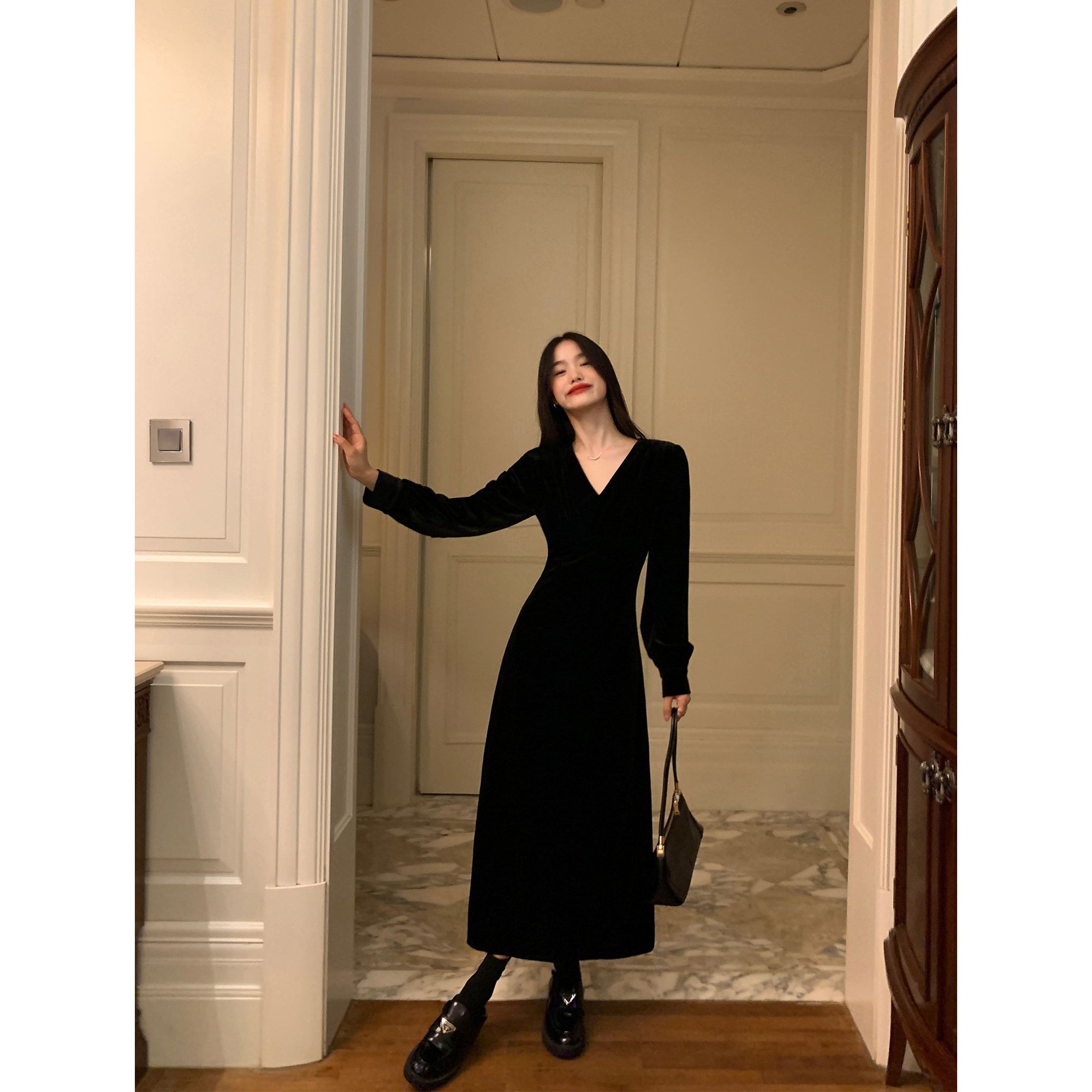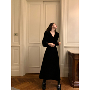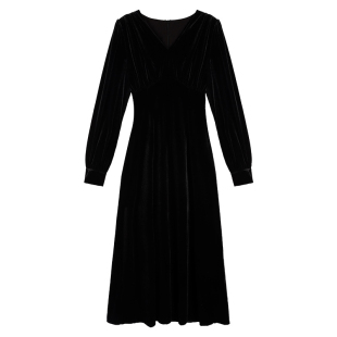 气质v领收腰显瘦中长款 法式 裙子 高级感丝绒连衣裙女新款 pusumede