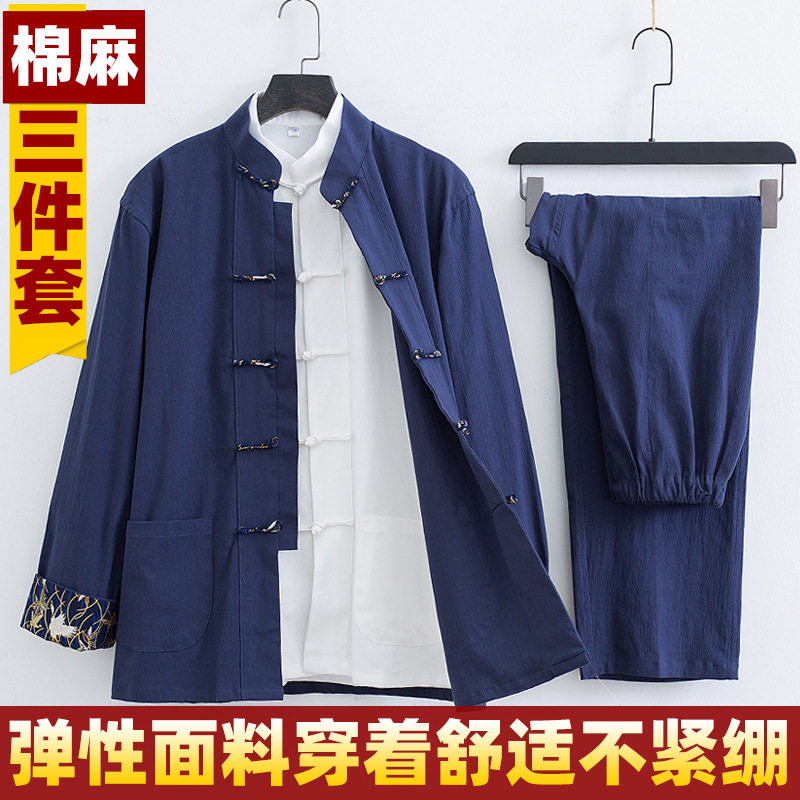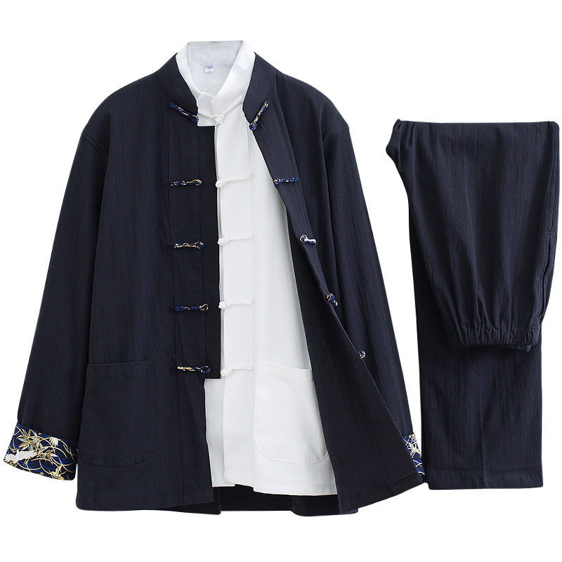 男式 文艺男装 青年汉服套装 休闲茶服复古盘扣长袖 棉麻中式 国风唐装