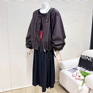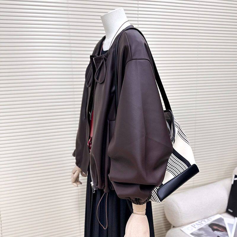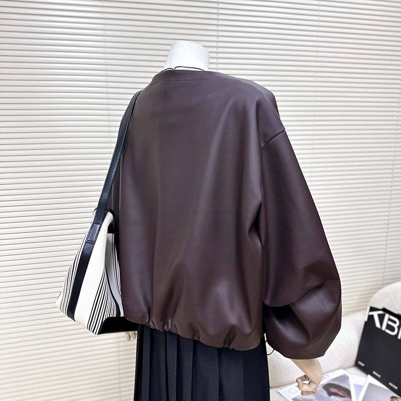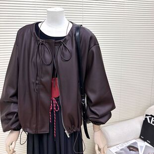 美拉德红咖色超软皮衣外套女2024春秋季 韩系宽松圆领PU皮上衣 新款