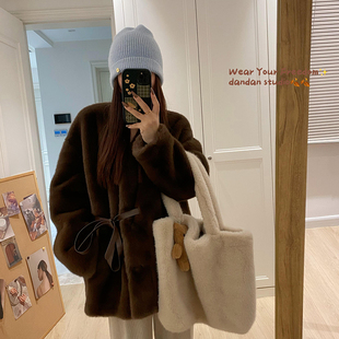 韩系牛角 皮草女冬毛毛外套 100羊羔毛皮毛一体宽松慵懒立领中长款