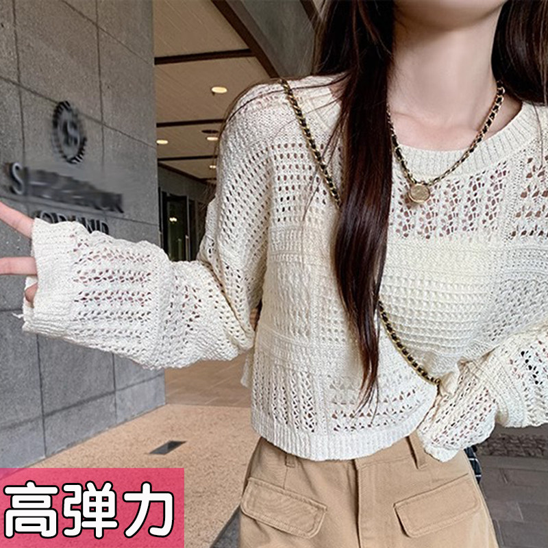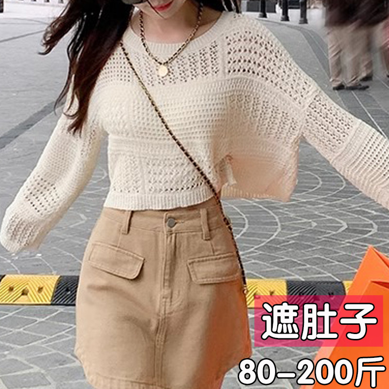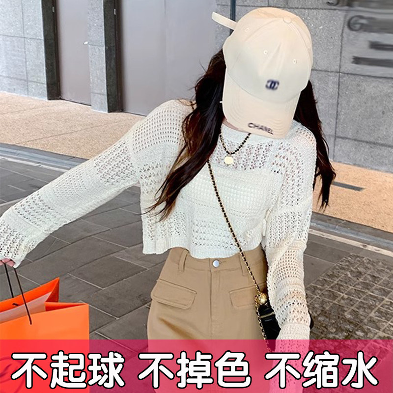 冰丝防晒罩衫 长袖 女夏季 外搭针织衫 上衣胖mm 大码 套头短款 镂空薄款