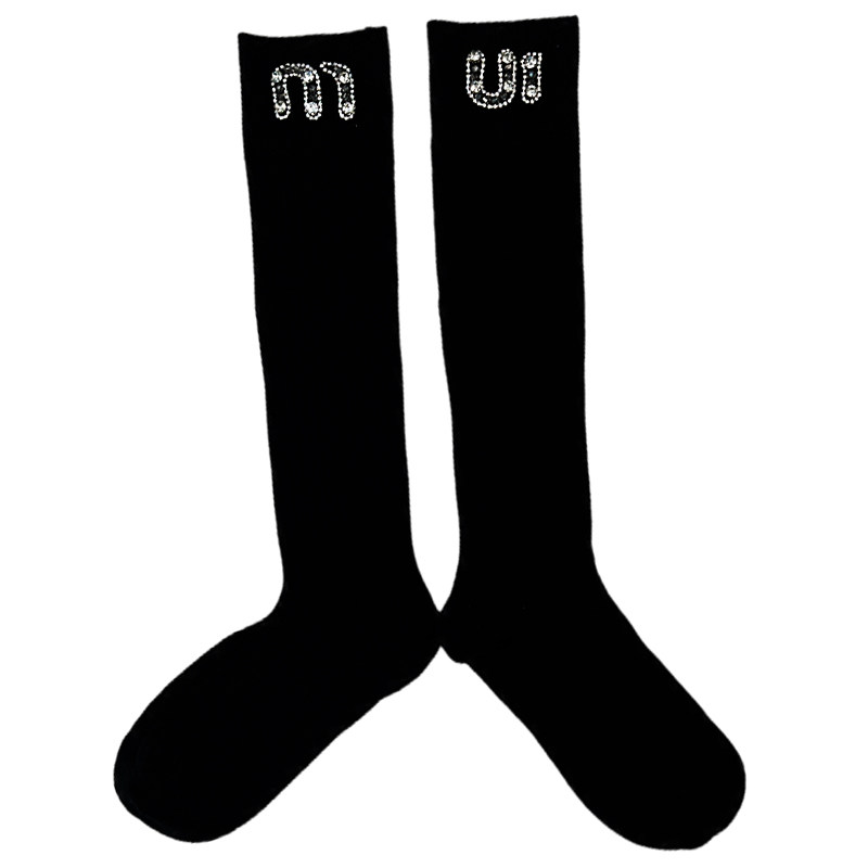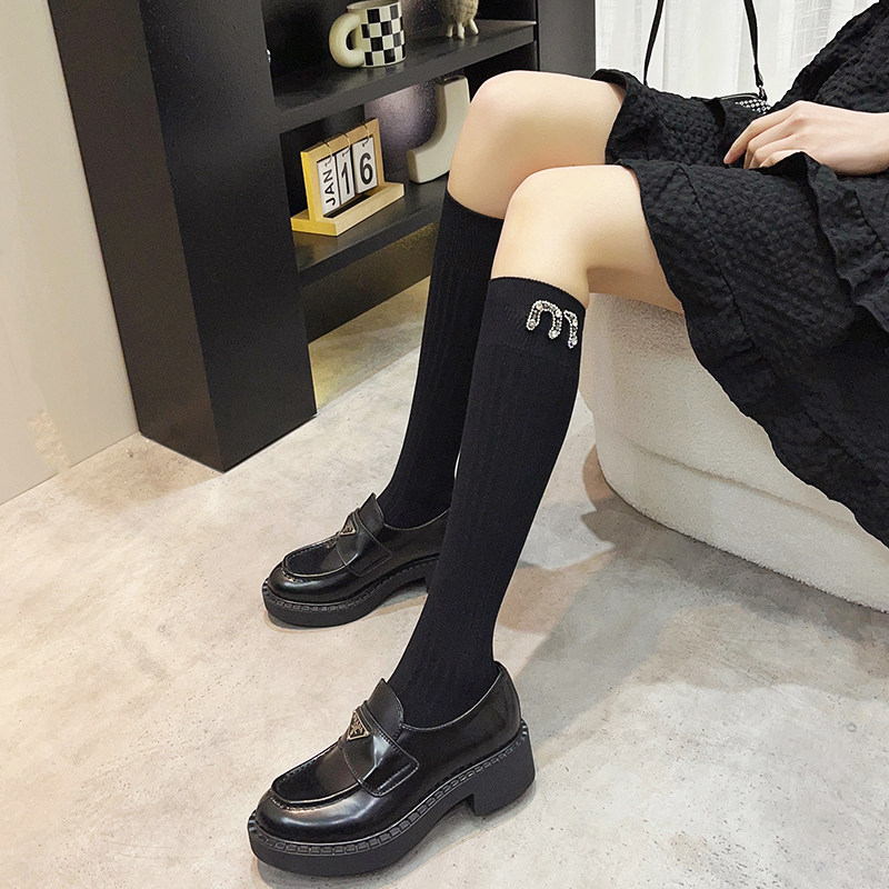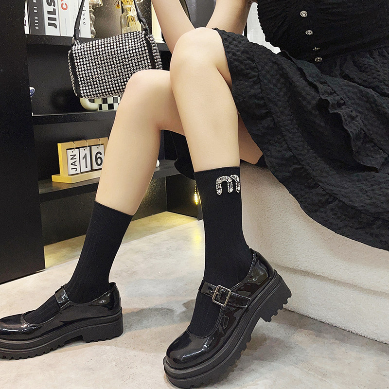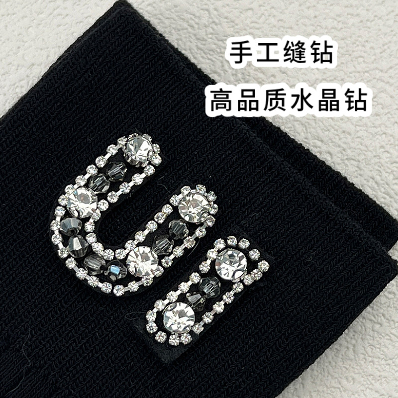 M字母水晶带钻欧货袜子欧洲站轻奢装 饰黑白色春夏中长筒jk小腿袜