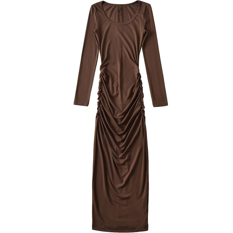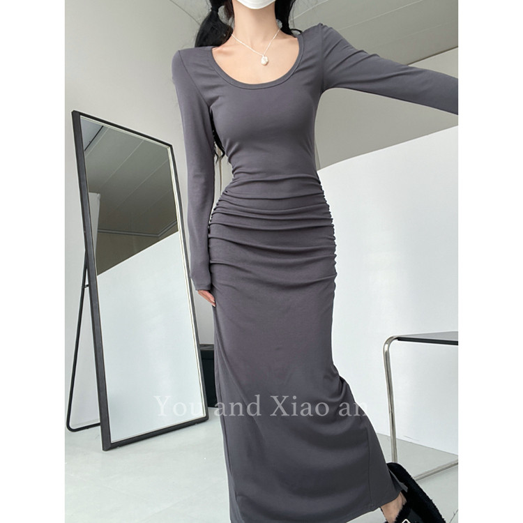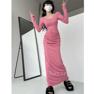 卡戴珊性感辣妹低领修身 鱼尾连衣裙 显瘦褶皱打底裙后开叉包臀长袖
