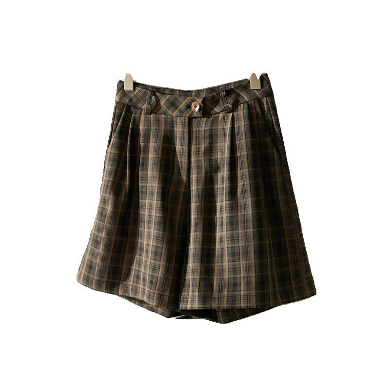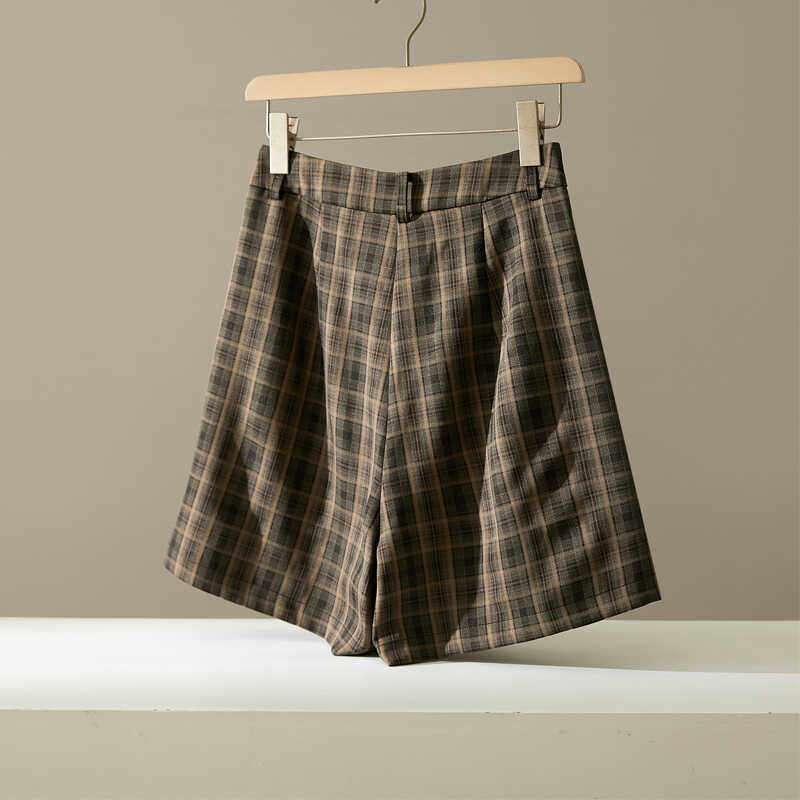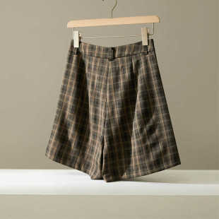 短裤 直筒中裤 女夏季 垂感阔腿裤 复古高腰休闲宽松薄款 格子五分西装