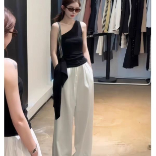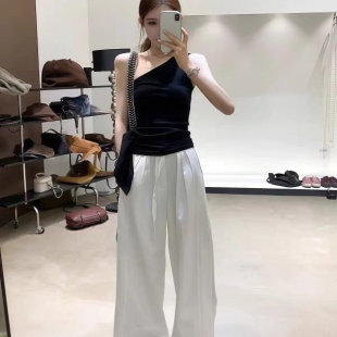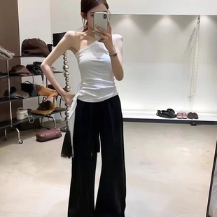 辣妹T恤上衣 新款 纯欲性感斜肩无袖 绑带收腰显瘦设计感背心女夏季