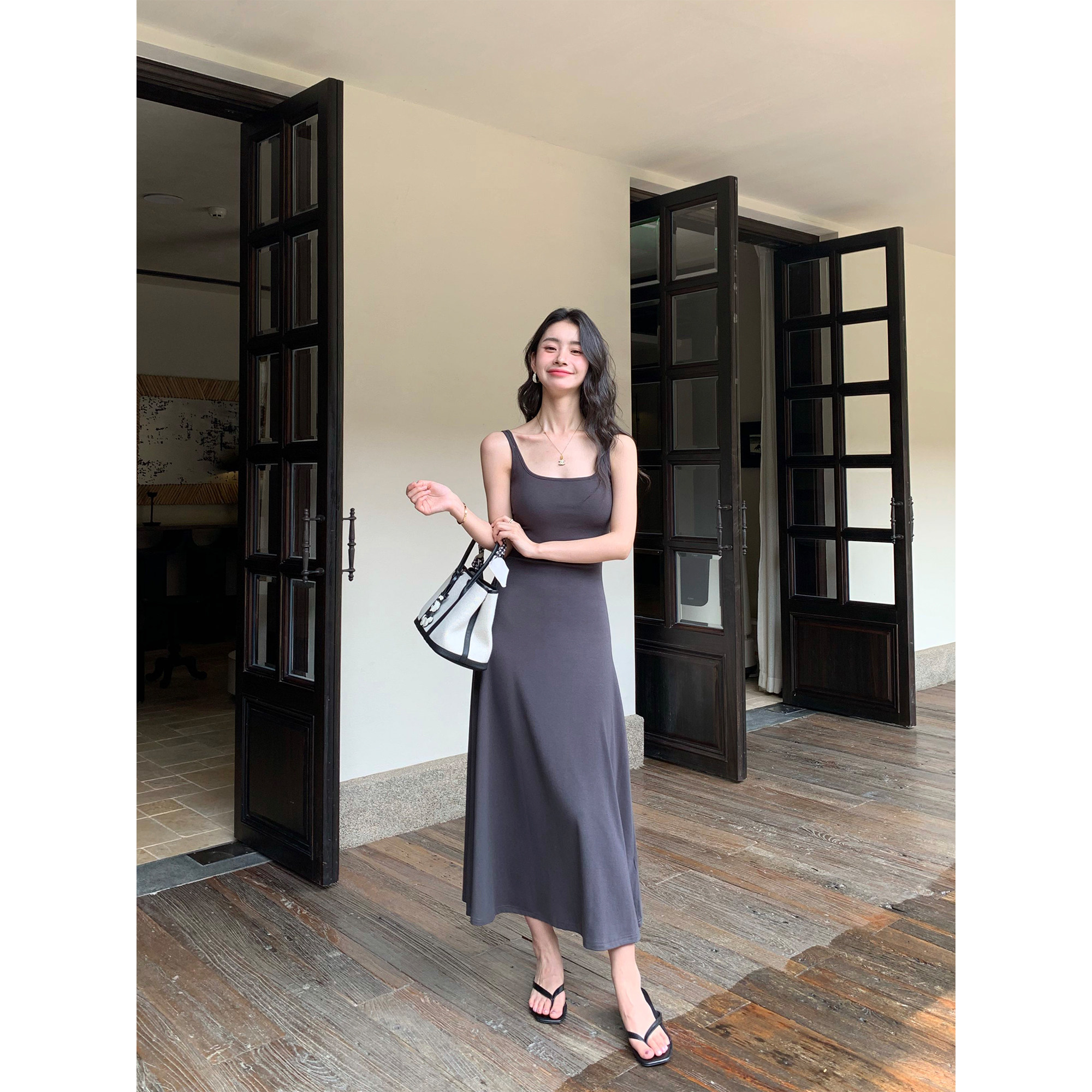大摆裙 高级感黑色方领带胸垫吊带连衣裙女长款 pusumede 气质女主