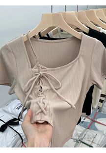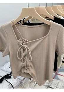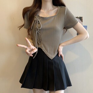 高腰百褶裙套女秋 t恤女 夏季 绑带上衣短裙两件套女不规则抽绳短袖