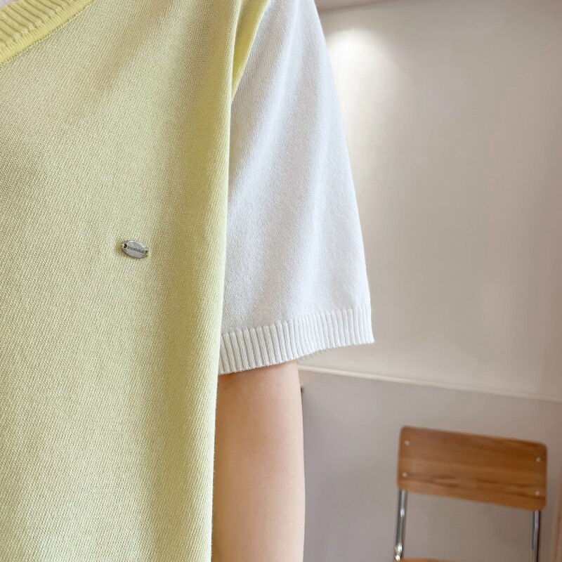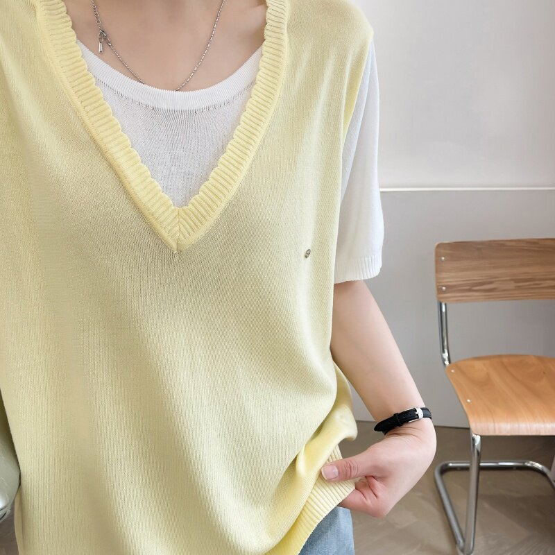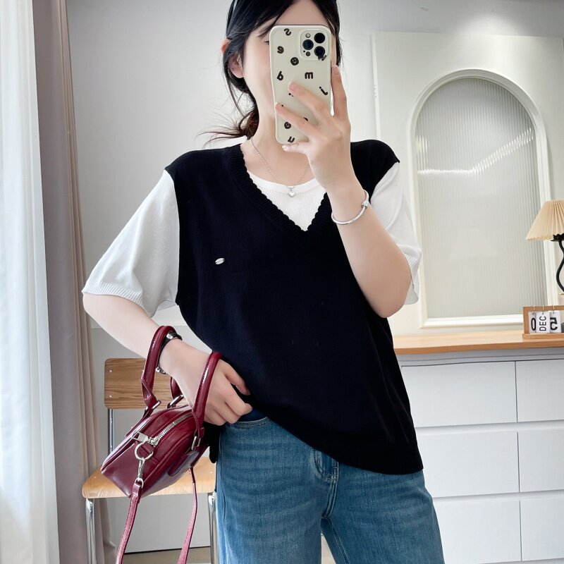 胖mm设计感撞色假两件小标短袖 2025夏装 女大码 冰丝针织衫 t恤 新款