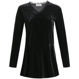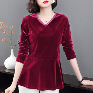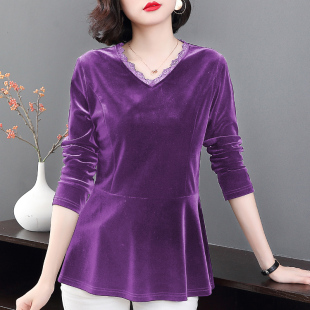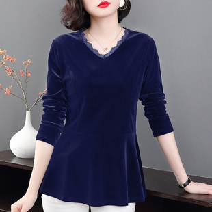 2025春秋新款 宽松打底衫 黑色v领长袖 中长款 t恤大码 金丝绒上衣女装