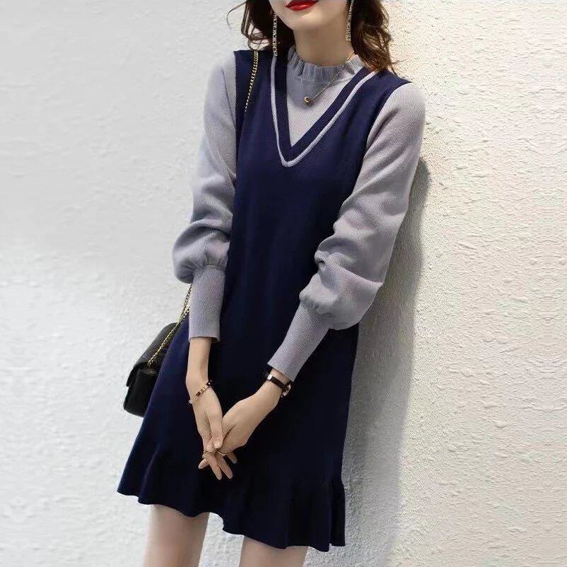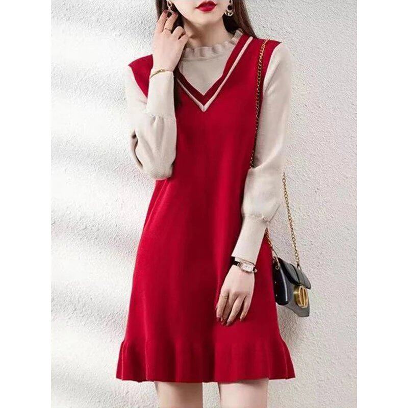 连衣裙简约韩版 淑女宽松型X型荷叶边裙春秋针织面料套头V领长袖