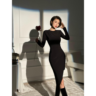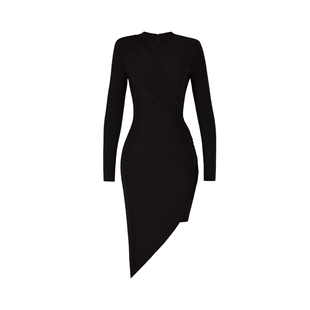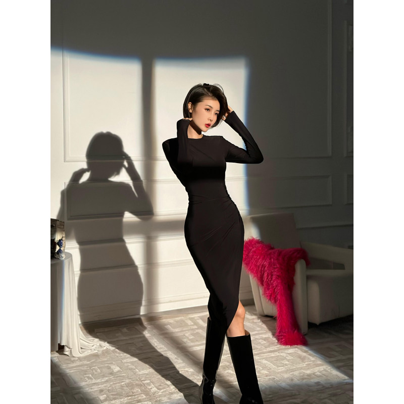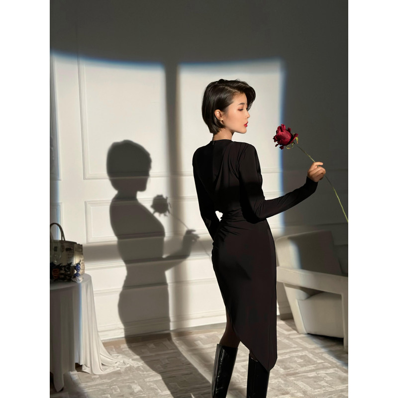XULU原创针织高阶简约休闲百搭气质复古圆领长袖 不规则下摆连衣裙