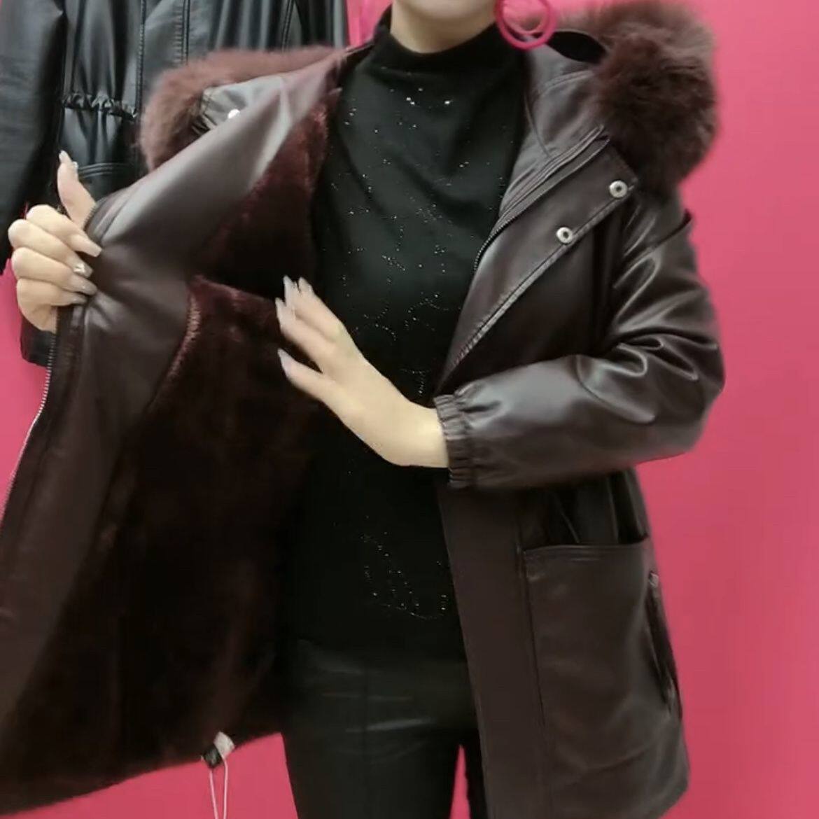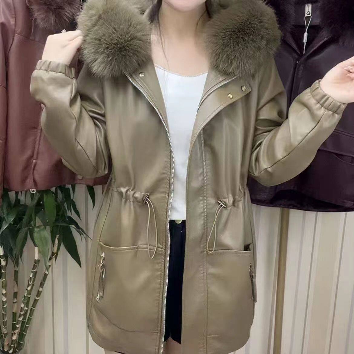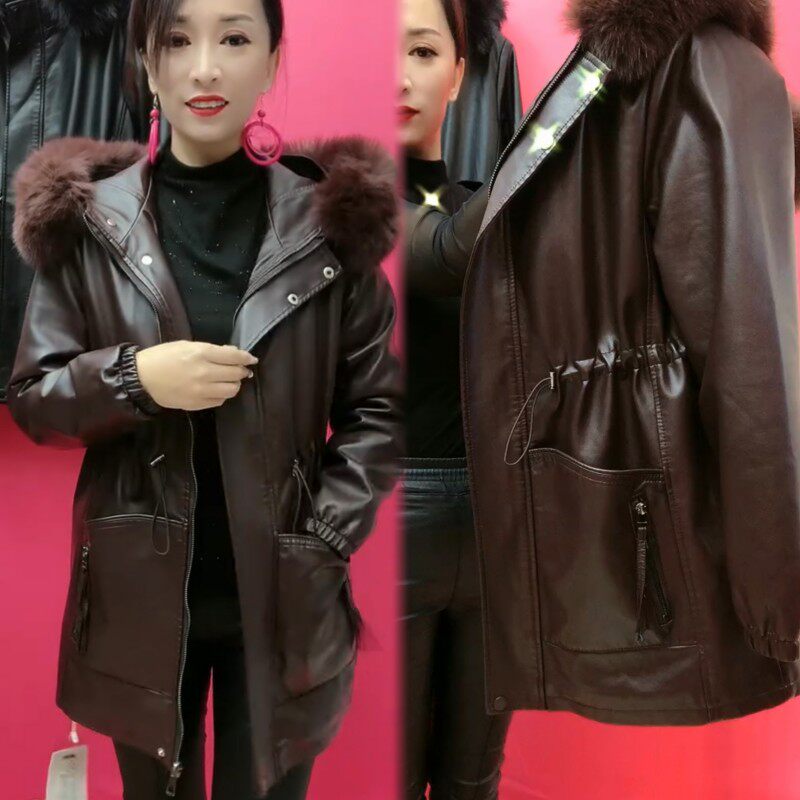 PU皮衣外套女中年人秋冬装 新款 棉服时尚 中长款 加绒加厚潮 妈妈冬装