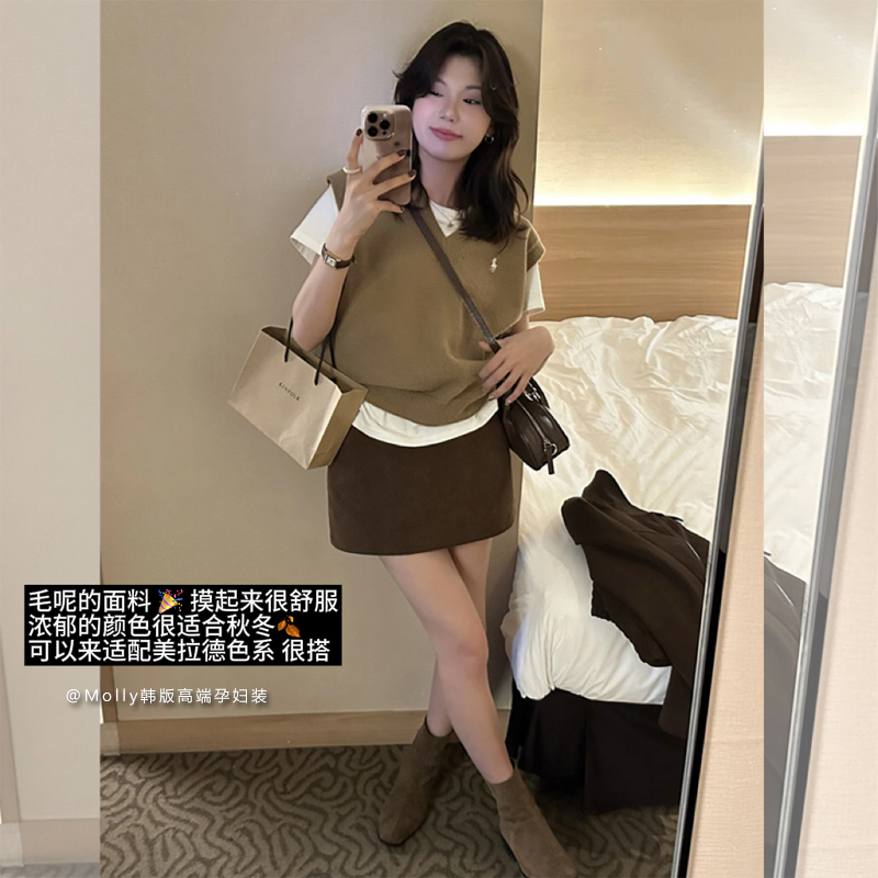 孕妇棕色毛呢包臀短裙春秋外穿时尚 休闲A字一步裙打底托腹半身裙