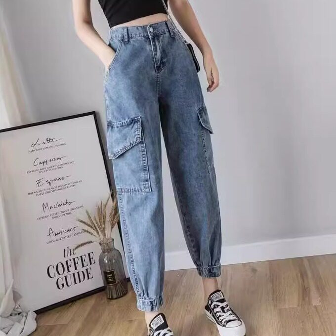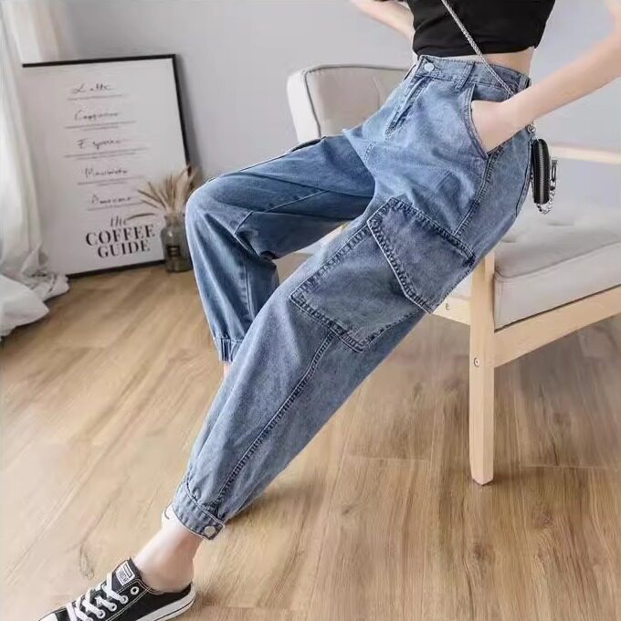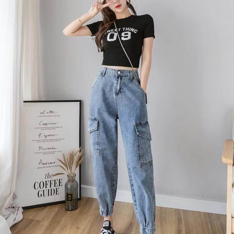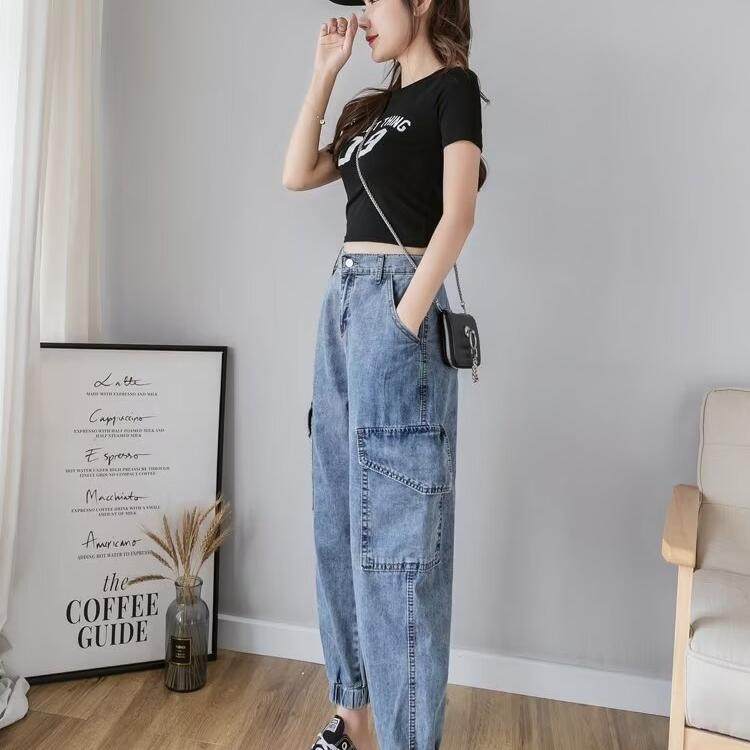 束脚松紧腰九分小个子显高搭配老爹裤 哈伦牛仔裤 女2024年春秋新款