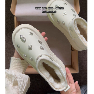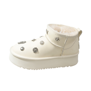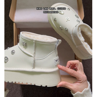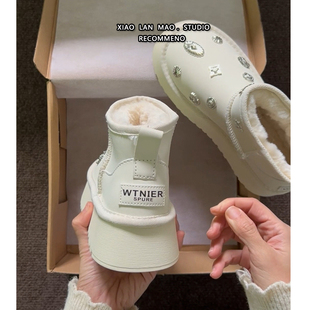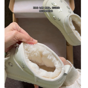 加绒加厚保暖短筒棉鞋 白色水钻厚底百搭增高雪地靴女2025冬季 新款