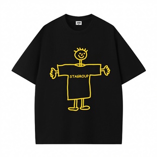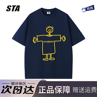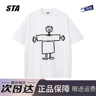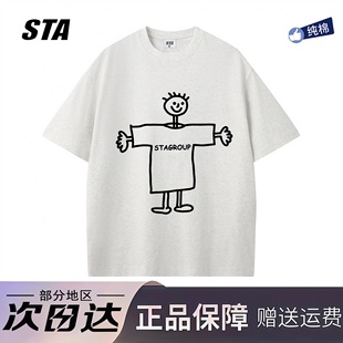 潮牌重磅纯棉情侣T恤 男女夏季 STA旗舰店美式 卡通拥抱笑脸印花短袖