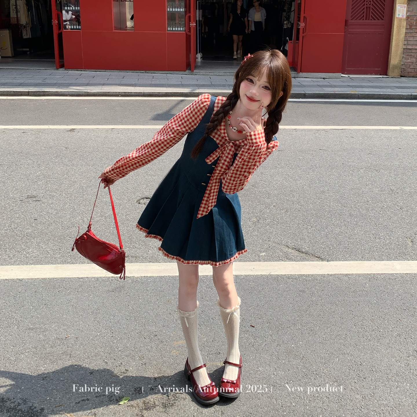 可爱减龄短裙子 甜美风红色格子连衣裙女秋泡泡袖 织物猪 树莓果酱