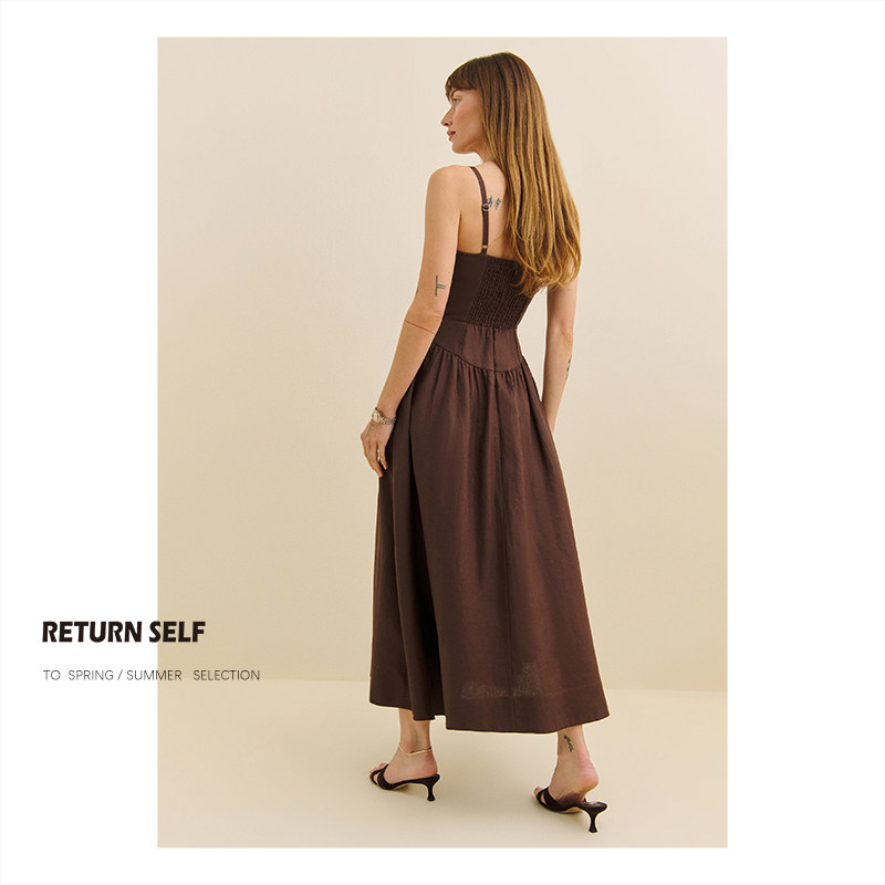 归己 一字领棉麻吊带连衣裙女夏度假收腰长裙 25年reformation新款