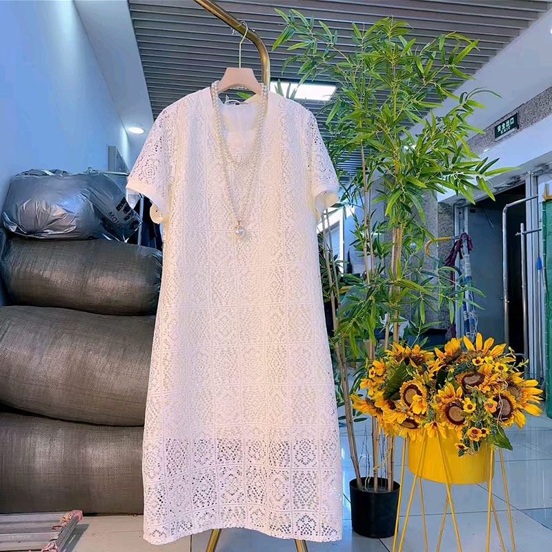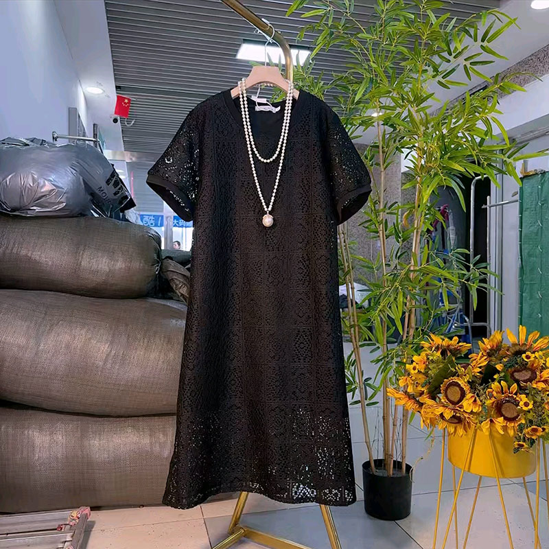 气质设计感通勤风长款 款 连衣裙 蕾丝裙胖妹妹2025夏季 加肥圆领短袖