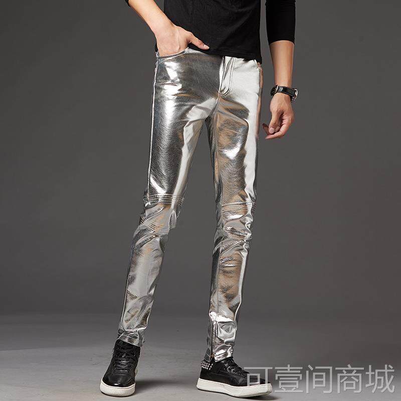 韩版 机车男式 修身 舞台演出男士 亮面银色中腰 小脚裤 2025秋冬男皮裤