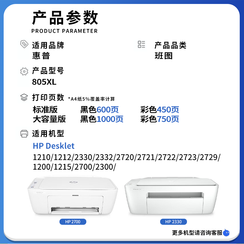 2729 2723 1212黑色2330 2332彩色dj2721 1210打印机DeskJet连喷XL 适用惠普805墨盒可加墨HP2720 2700 2722