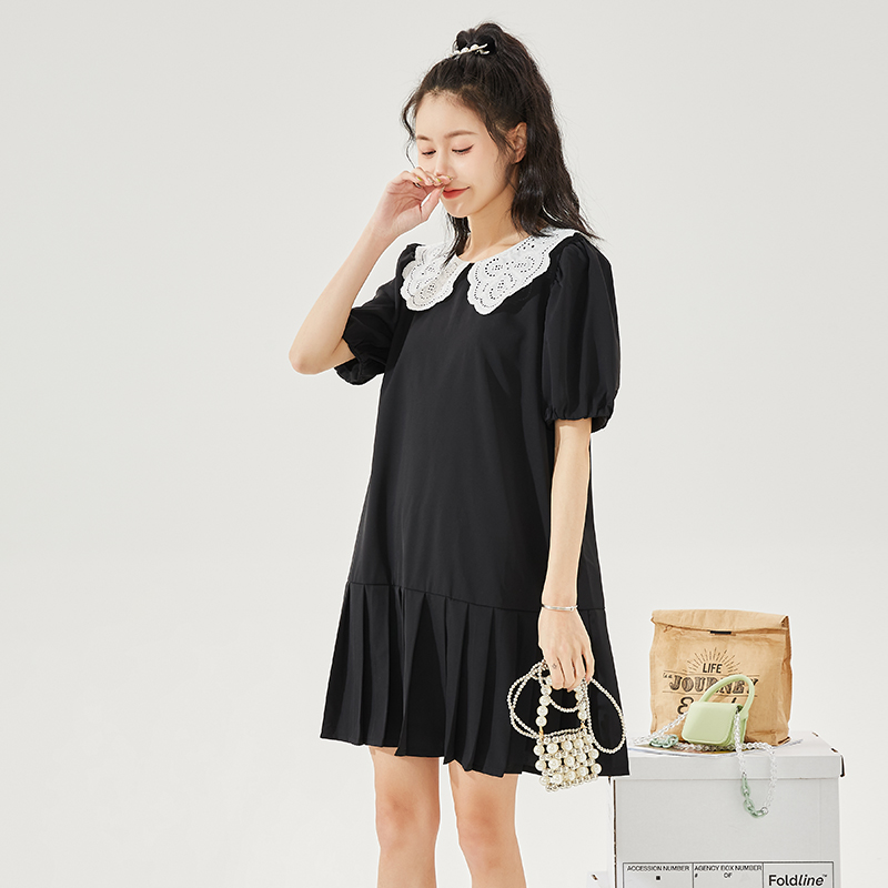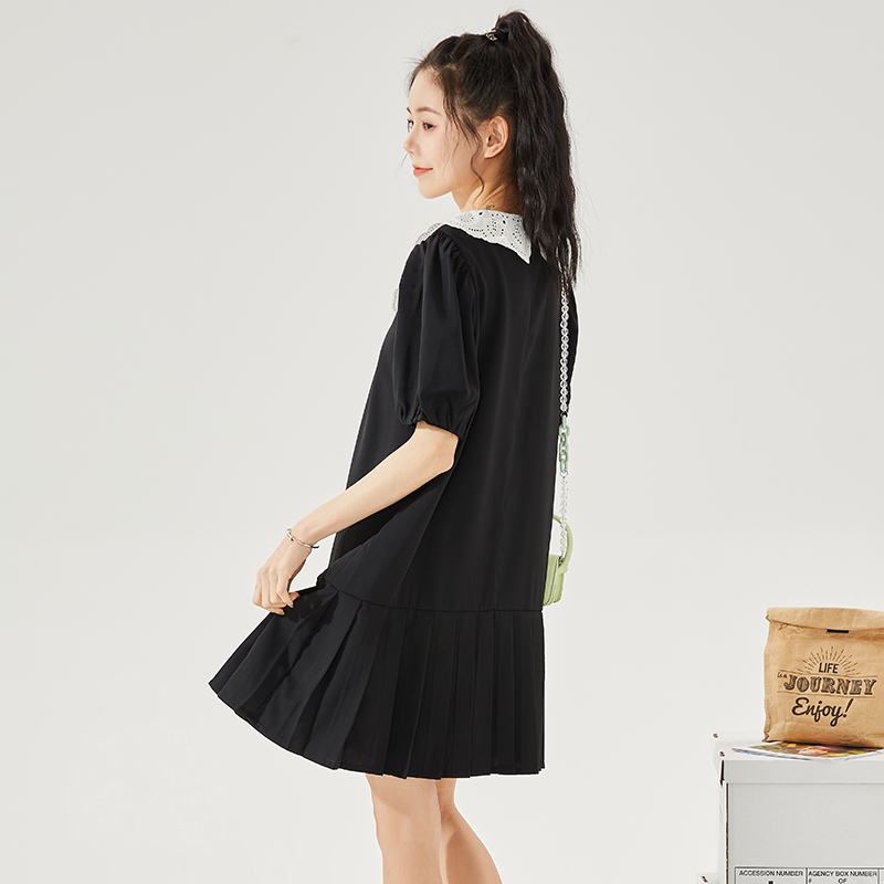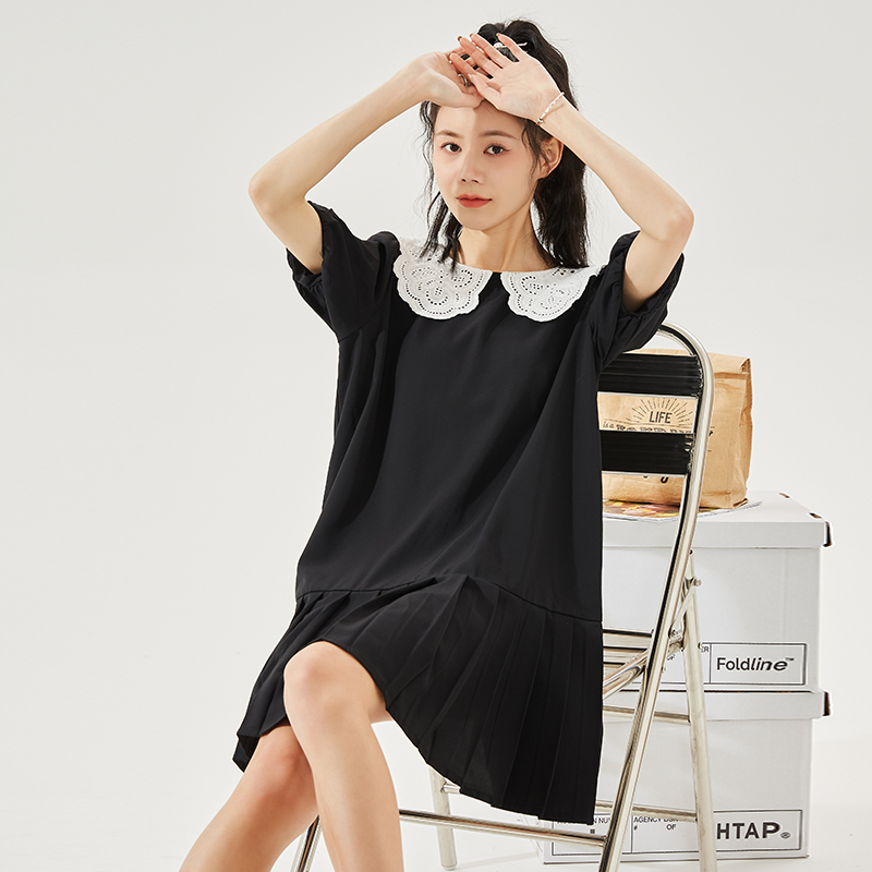 小黑裙百褶宽松裙子潮 学院风短款 唐狮娃娃领连衣裙夏季 女新款