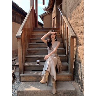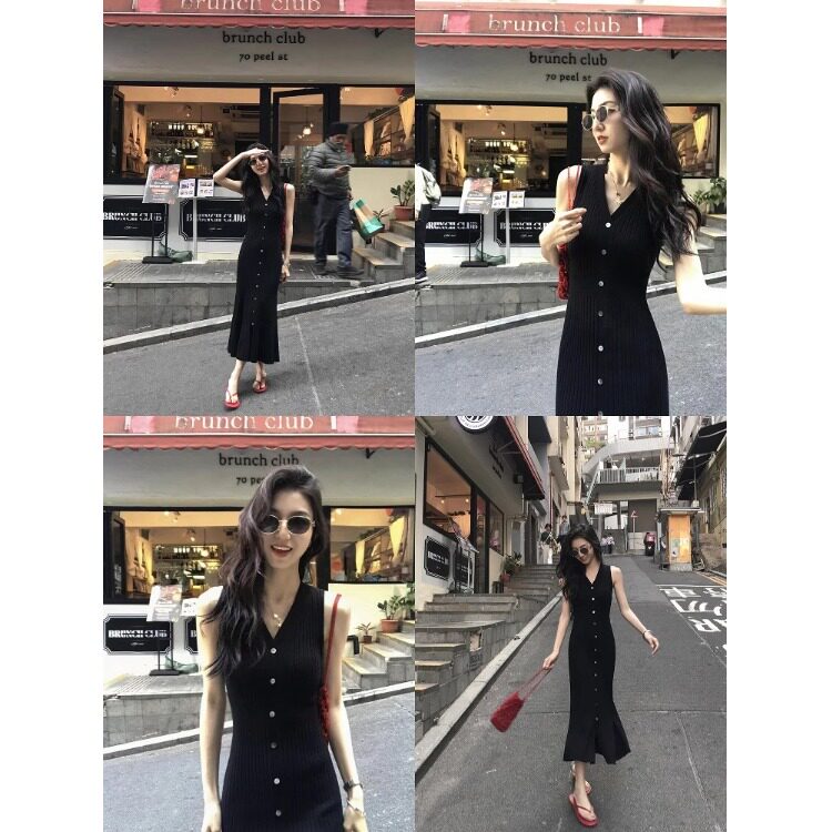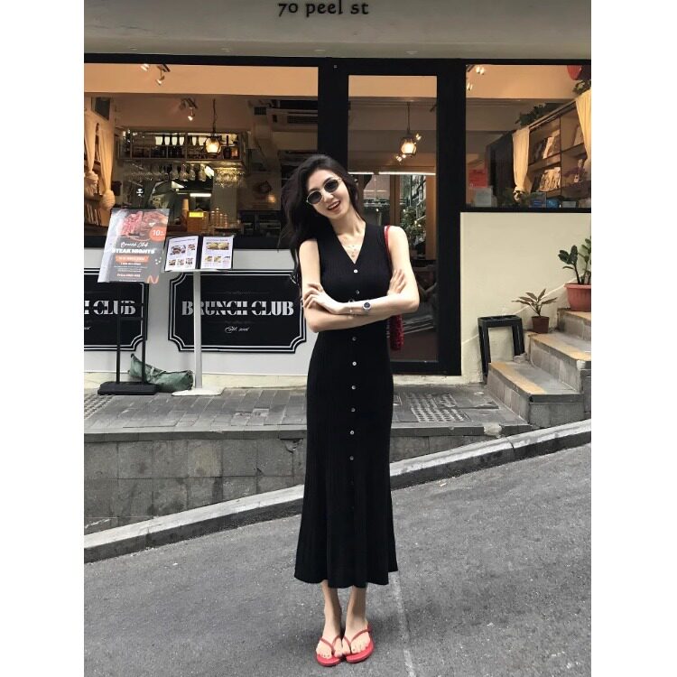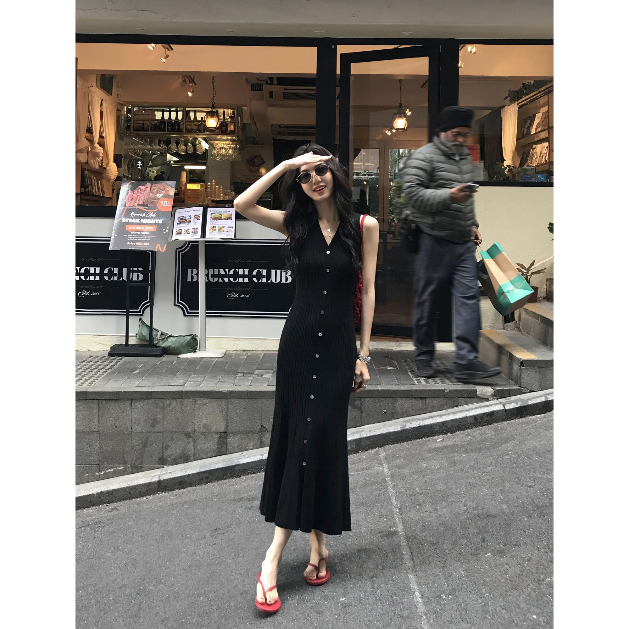 收腰长款 香香 软糯针织修身 连衣裙女夏季 背心包臀裙 气质V领无袖