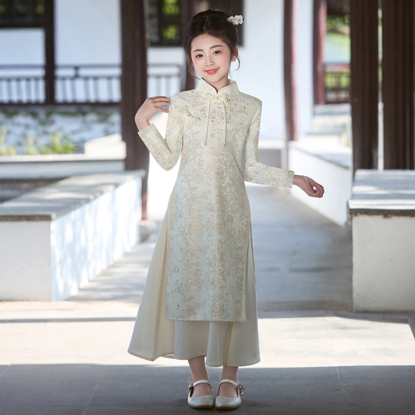 裙子 连衣裙女大童古筝演出服长袖 女童旗袍汉服儿童国风新中式 唐装