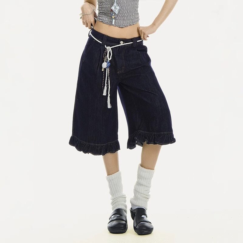 显瘦阔腿牛仔中裤 荷叶边设计感直筒七分牛仔裤 宽松大码 时尚 女夏季