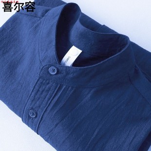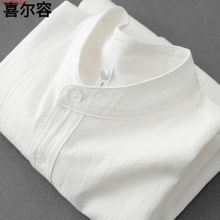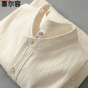 立领上衣男夏 纯色长袖 单穿打底两不误杏色白色亨利领棉麻短袖 衬衫