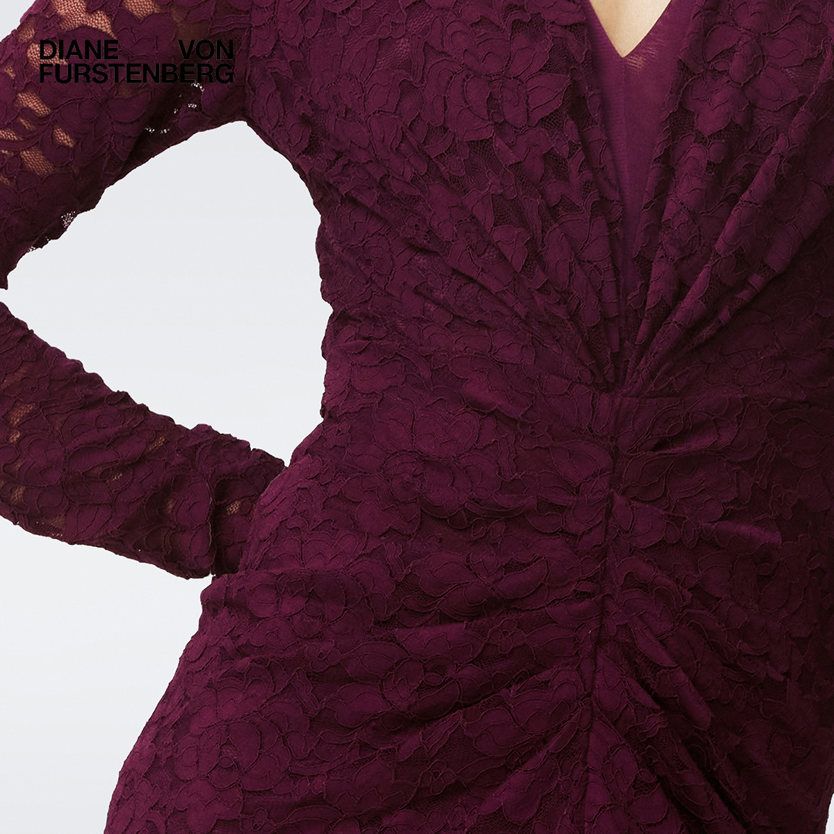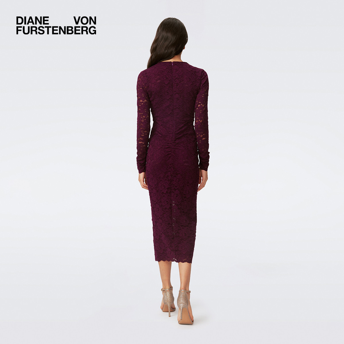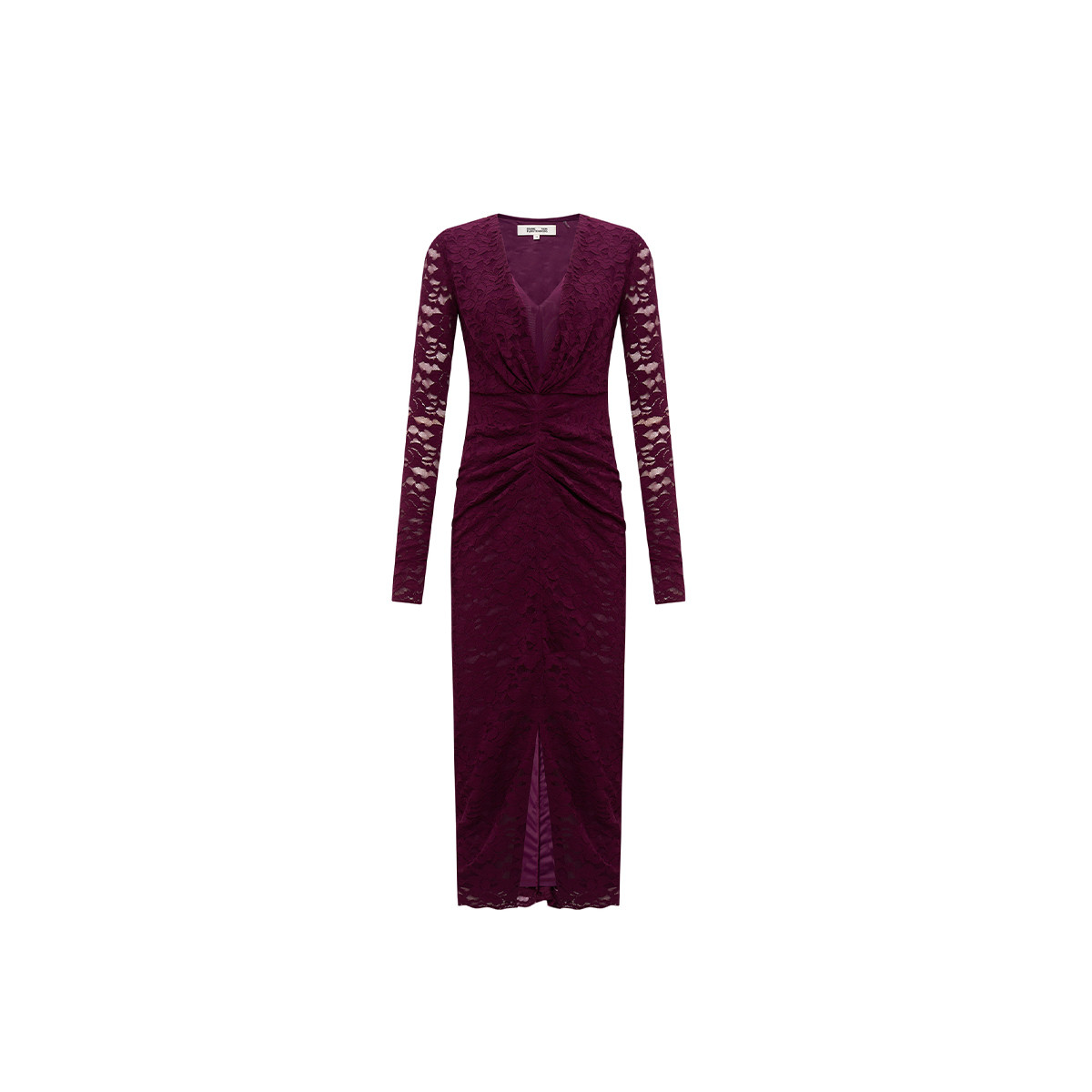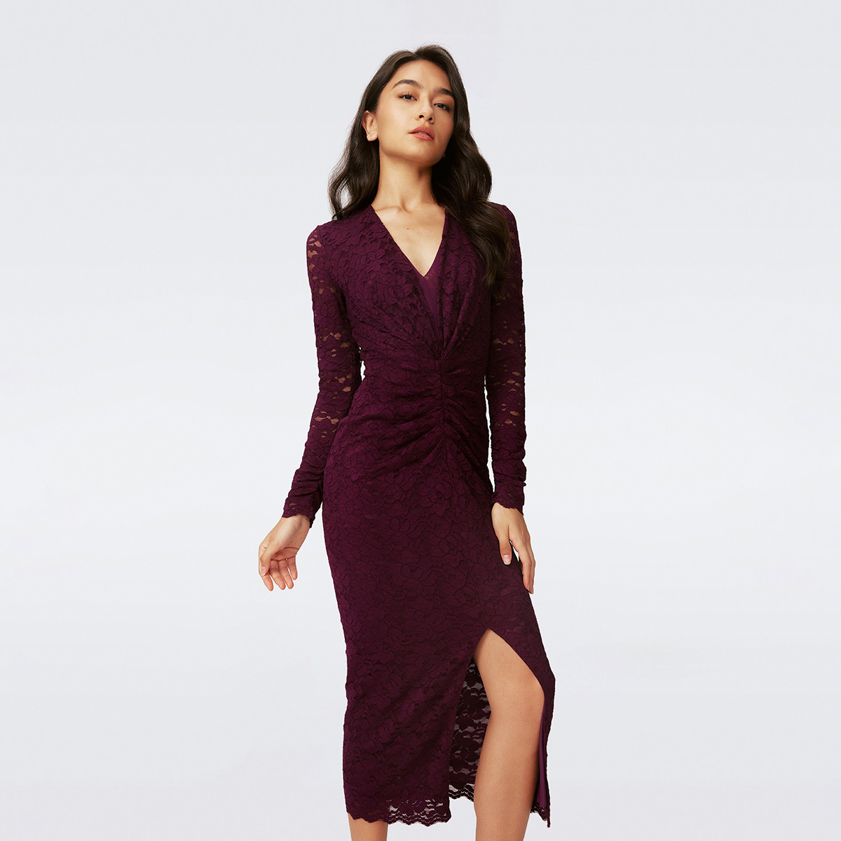 DVF2025新款 梅子红开衩弹力蕾丝连衣裙DL3S010