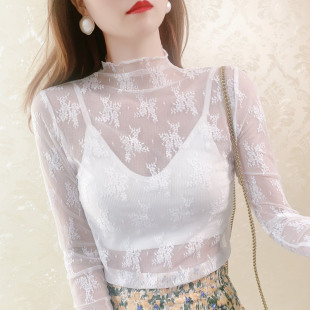 网纱上衣薄款 毛衣内搭纱衣秋冬新款 潮 女长袖 透明半高领蕾丝打底衫