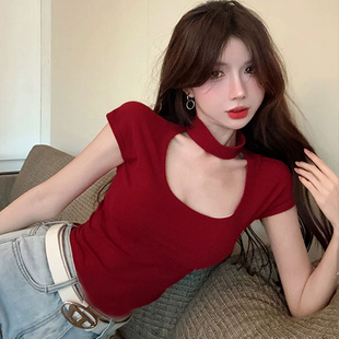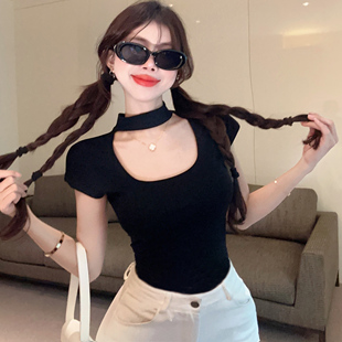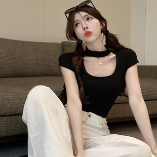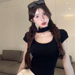 修身 夏装 显瘦设计感辣妹纯欲风上衣女 T恤女2025新款 方领挂脖短袖