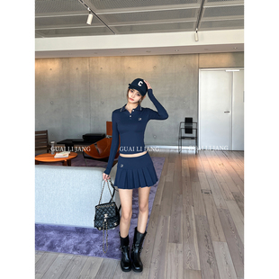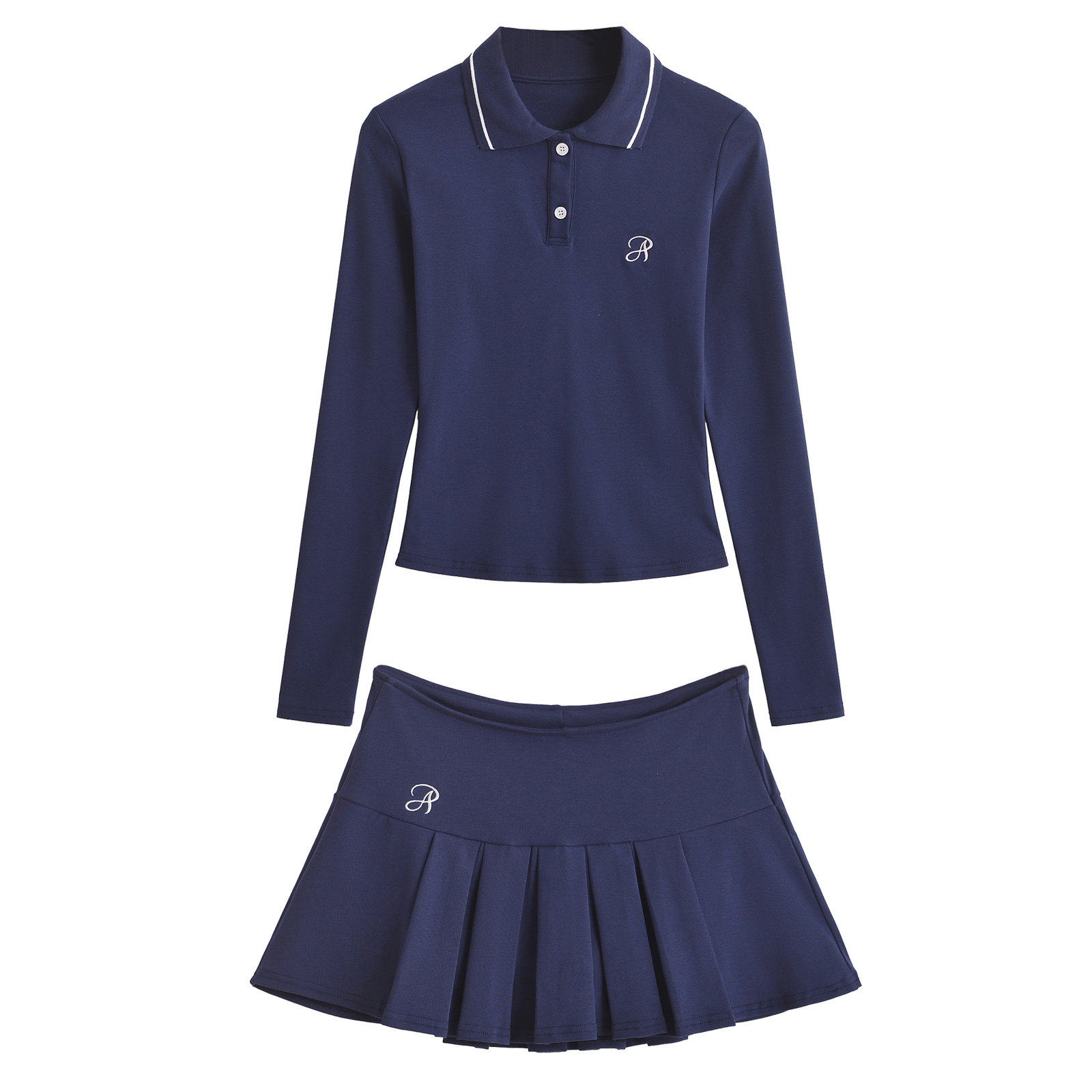 运动风辣妹两件套裙装 T恤绣花高腰百褶半身短裙 女春秋POLO领长袖