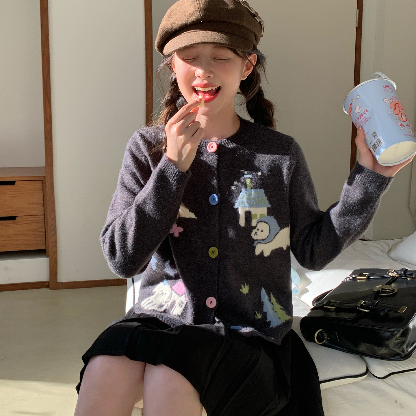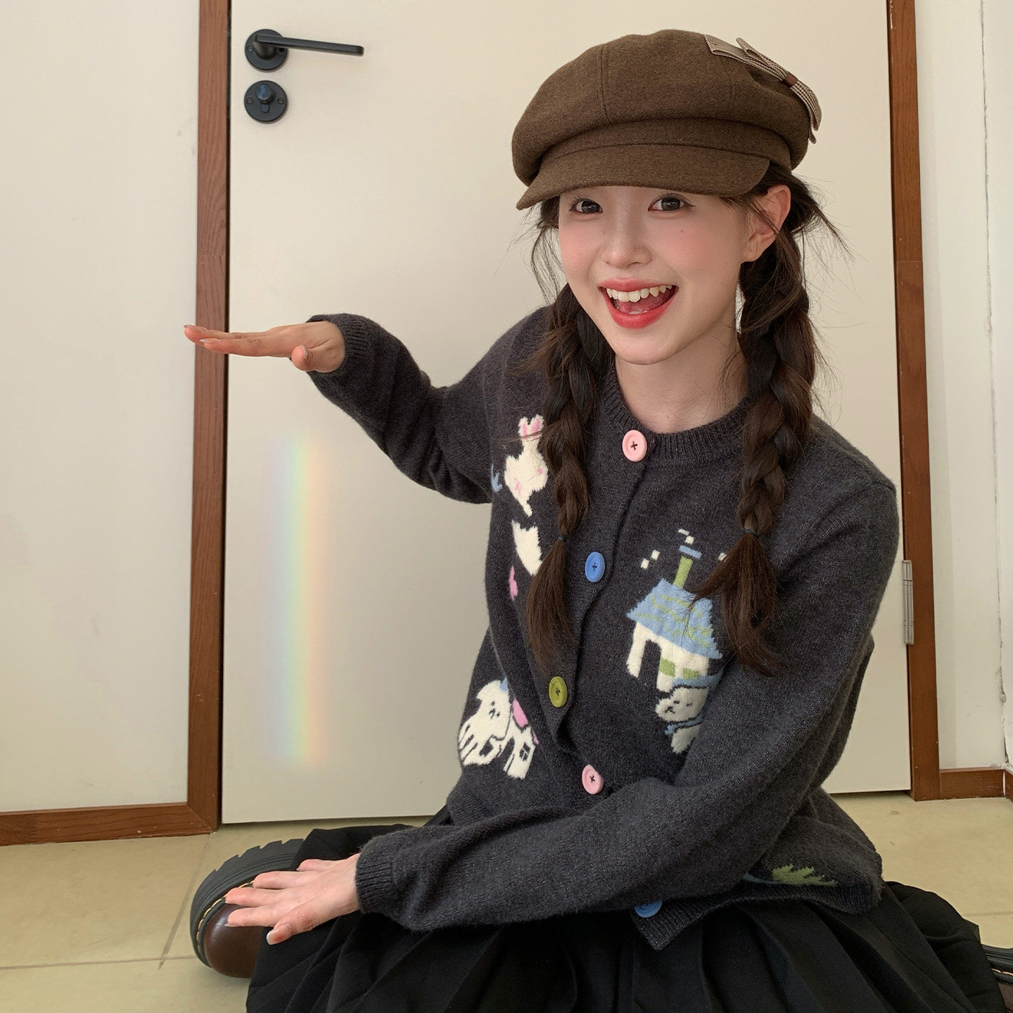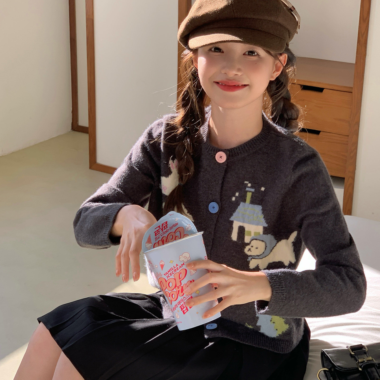 东京岁时记jk卡通针织开衫 学院风上衣宽松显瘦软糯灰色毛衣外套