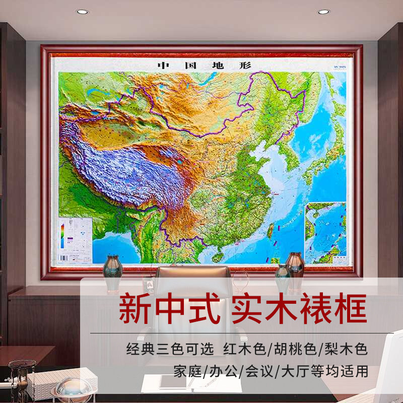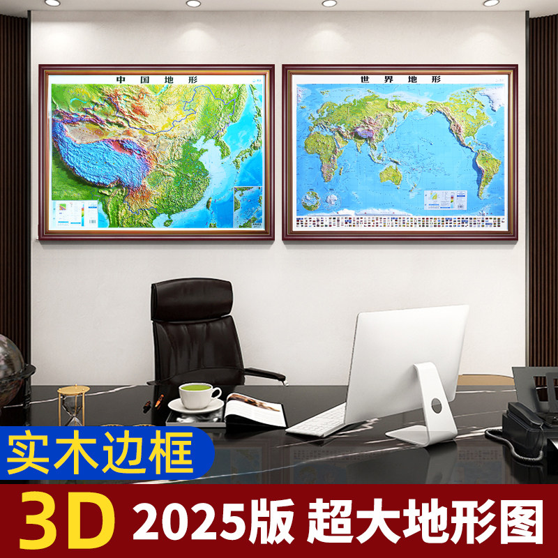 中国地图世界地图 高端大气装 裱地图画 饰会议室布置大厅装 2025年新版 3D立体凹凸地形三维地貌图办公装 饰画 实木裱框3d立体地图