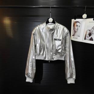 高街辣妹漆皮立领字母设计PU皮衣外套女宽松酷飒机车棒球服短夹克